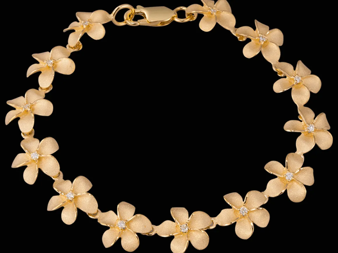 This plumeria bracelet is made from 14kyellow gold and features 13 diamonds totaling in 0.20 carats and 13pc flowers. The bracelet is made of solid gold with a sand blast finish.