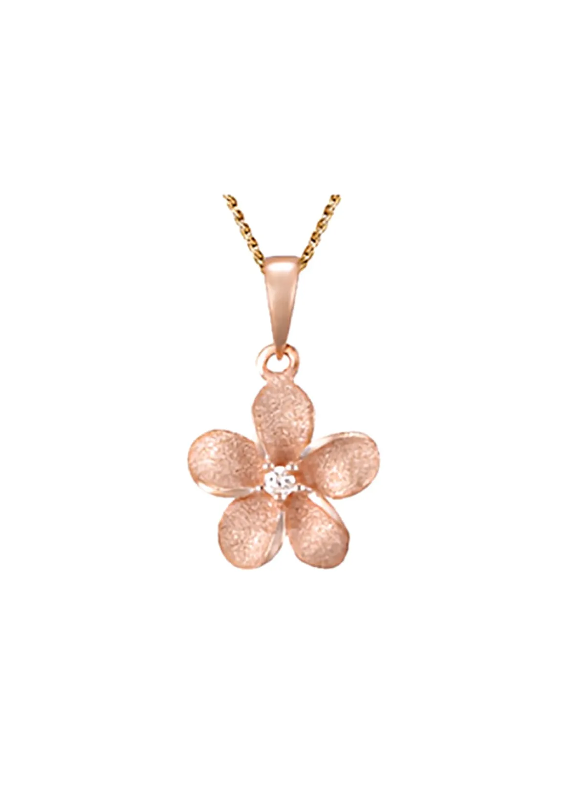 This is a 14k gold plumeria pendant by Denny Wong. It features one 0.02 carats diamond with a sand blast finish.