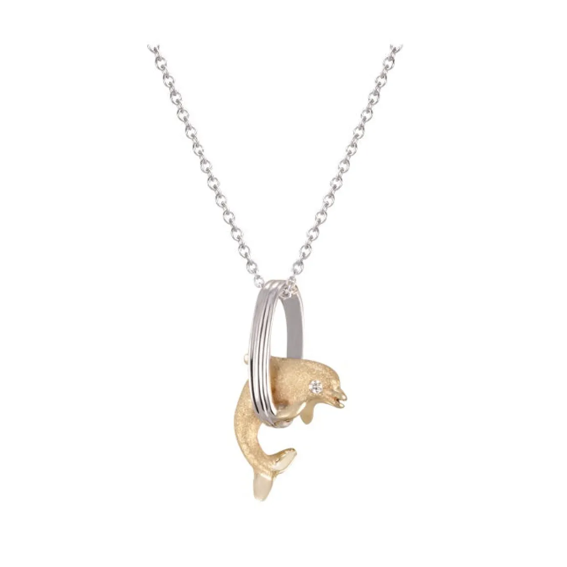 This is a14k 15mmgold pendantfinely handcrafted by Denny Wong.It features a single yellow gold dolphin jumping in a white gold loop.