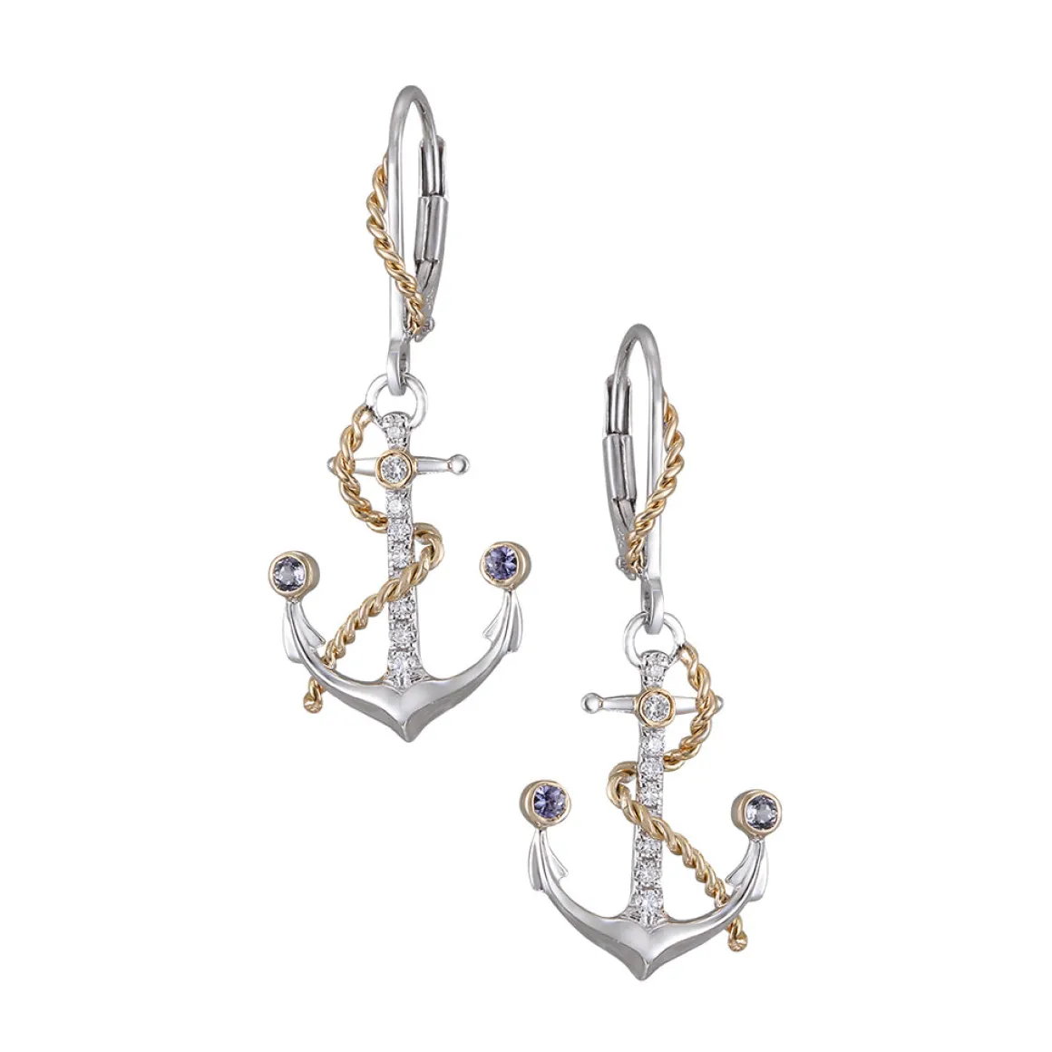 This earring features a two toneanchor with dangle leverback and eighteen diamonds totaling in 0.10 carats and four tanzanitestotaling in 0.11carats. Get yours today!
