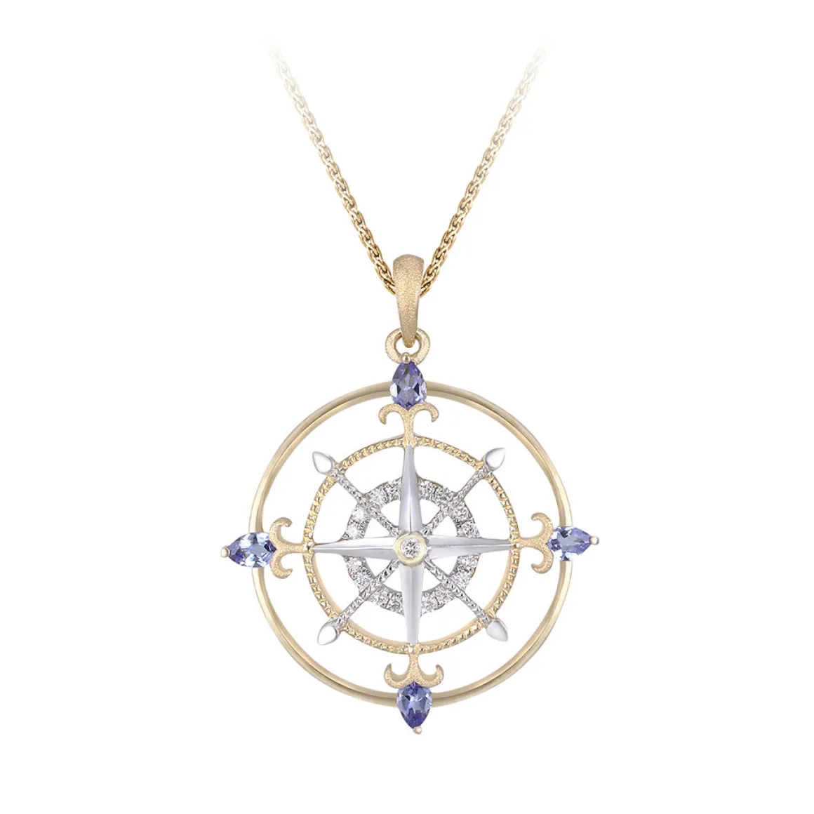 Denny Wong did a great job creating thiscompass rose pendant. This is made from 14k yellow gold and white gold with seventeen diamonds totaling 0.07 carats and four tanzanites totaling 0.25 carats. Get yours today!