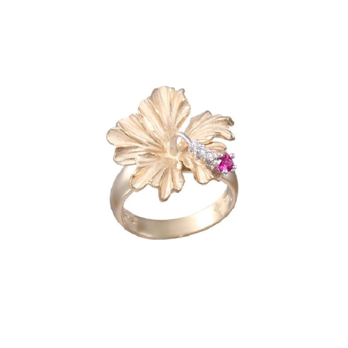 This ring features a hibiscus flower with a ruby and diamond coming out of the center. The quality is excellent and made by esteemedjeweler Denny Wong.
