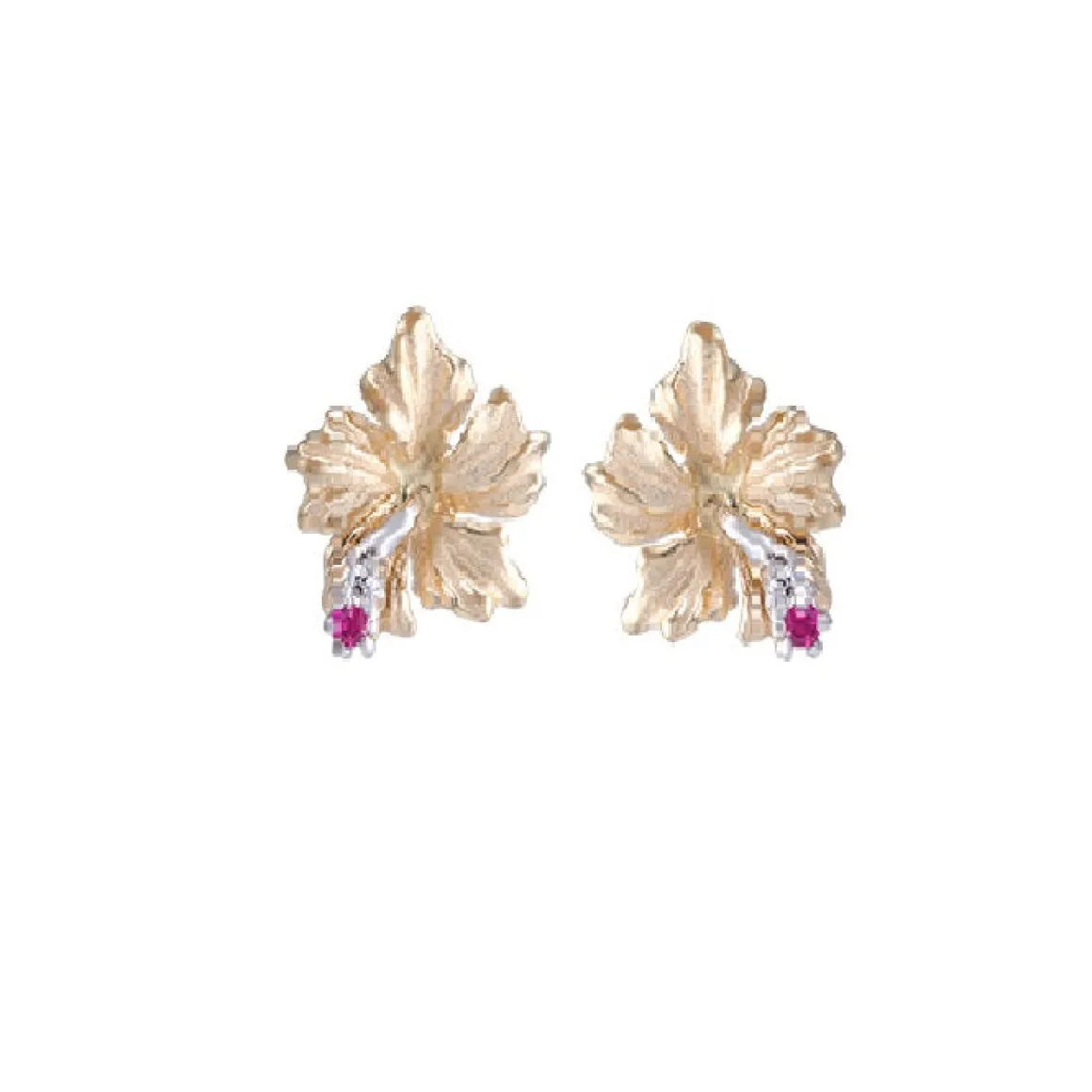 This is a 14kHibiscus earrings with rubies and diamonds made by esteemed jeweler Denny Wong. The earring is made of solid gold with a sand blast finish.