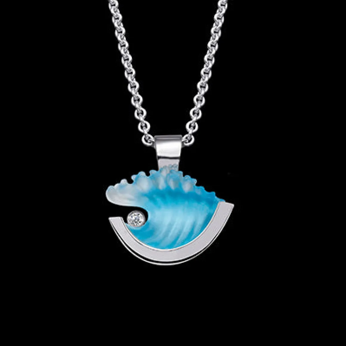 Matt Bezak’s wave pendants are made entirely by hand upon order. This wave pendant is made of 14k white gold and glass. It features one .04 carat diamond set at the base of the waves curl. The blue wave portion is made of hand casted glass, which gives this pendant an incredibly unique and original look.