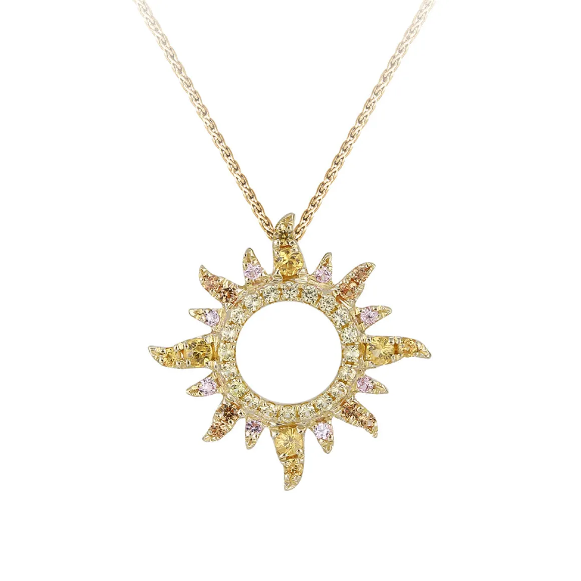 Denny Wong did a great job creating thissunburstpendant. This is made from 14k yellow gold withforty-four colored sapphires totaling 0.39 carats. Get yours today!