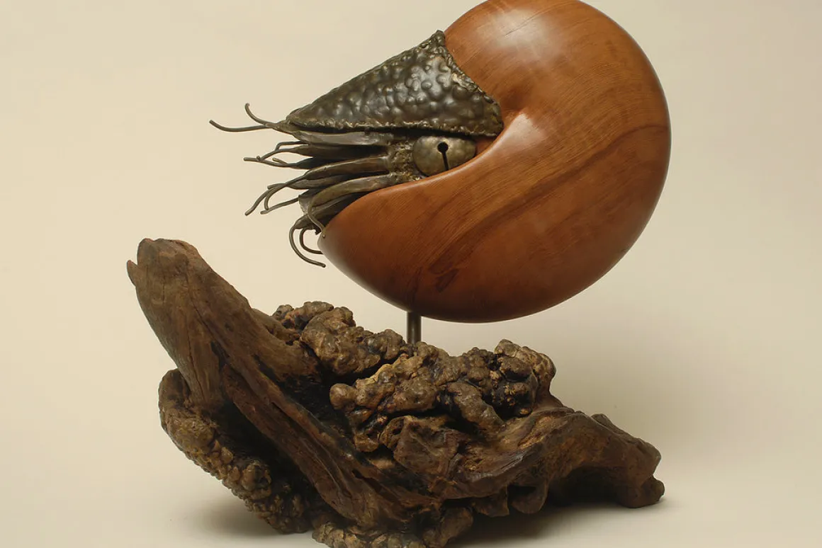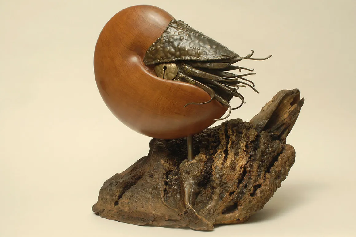 Considered to be a living fossil, nautiluses are ancient relatives of squid. Unlike squid, they have a shell, which has a series of chambers where air is added or subtracted to obtain neutral buoyancy. In all renditions of Ancient Mariner, the the body of the nautilus is forged and welded of bronze, while the shell has been carved from various rare or exotic woods, including quillo bordon and curly redwood. Bases for Ancient Mariner have varied from manzanita burl to driftwood, for both tabletop display and wall mounting.