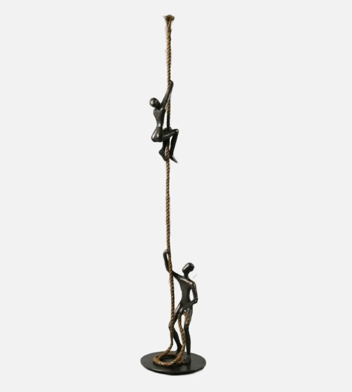 The sculpture tells a story of partnership and perseverance. The upper figure, arms raised in victory, has climbed high—but only because someone below holds the rope steady. Neither could ascend alone. It’s a meditation on mentorship, collaboration, and the truth that our greatest achievements are rarely solo endeavors.
