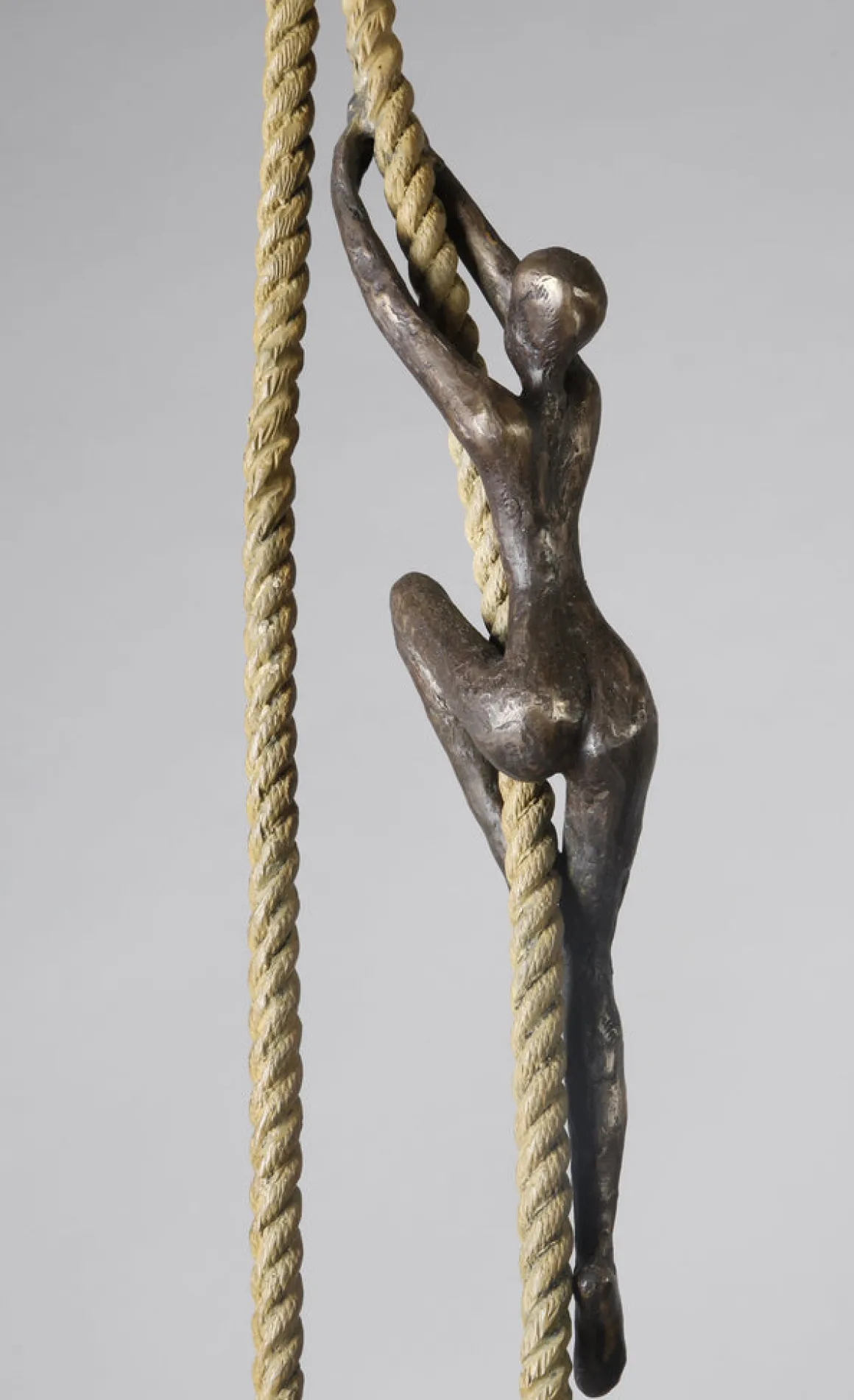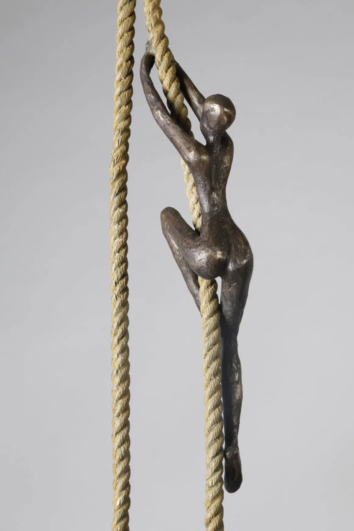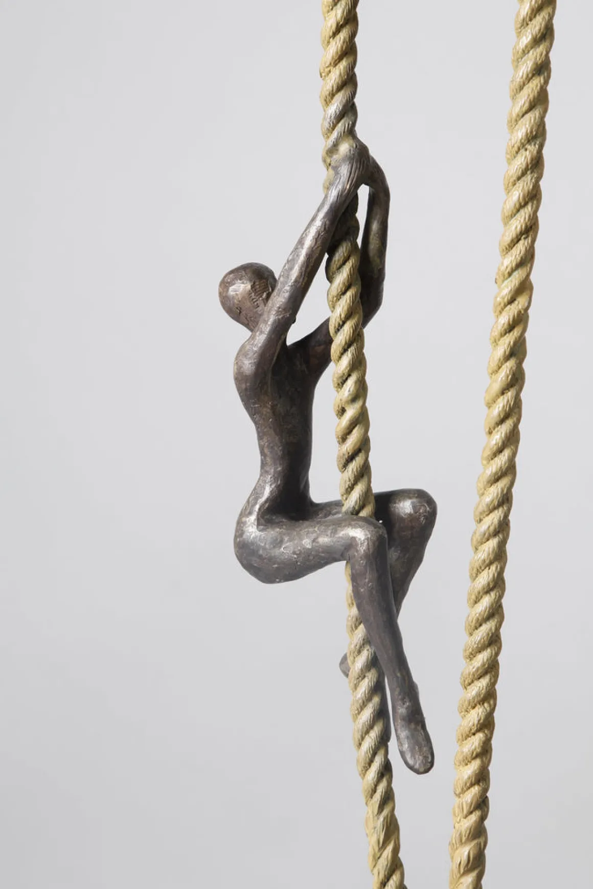 Aspiration Quadro expands the classic climbing figure into a quartet of ascent. Four dark bronze figures scale a single golden rope—spaced along its length like notes on a musical staff, each at their own stage in the journey, yet all moving in the same direction: upward.