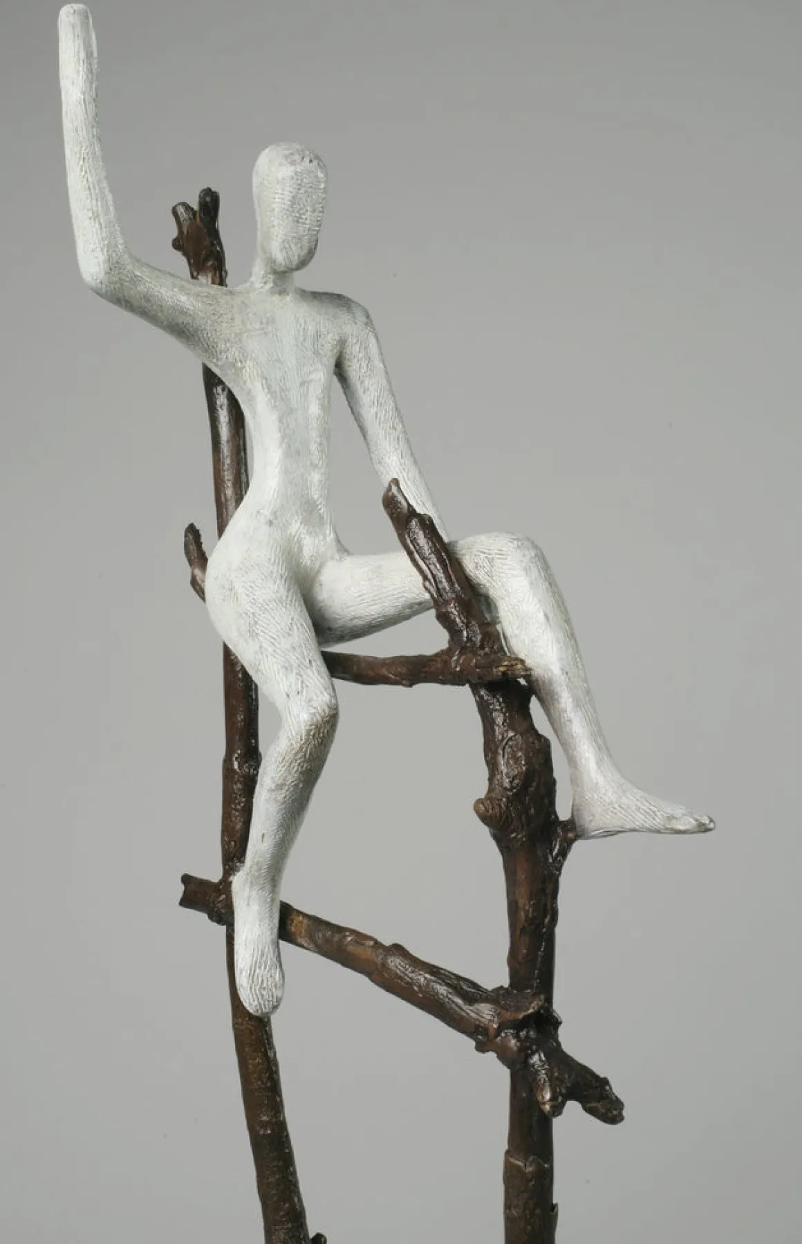 Assisted Success celebrates achievement as a collective endeavor. Two figures with pale verdigris patina scale a rustic ladder of intertwined branches—at the summit, one sits in triumph, hand raised in victory, while below, another climbs eagerly, part of the same journey toward the top.