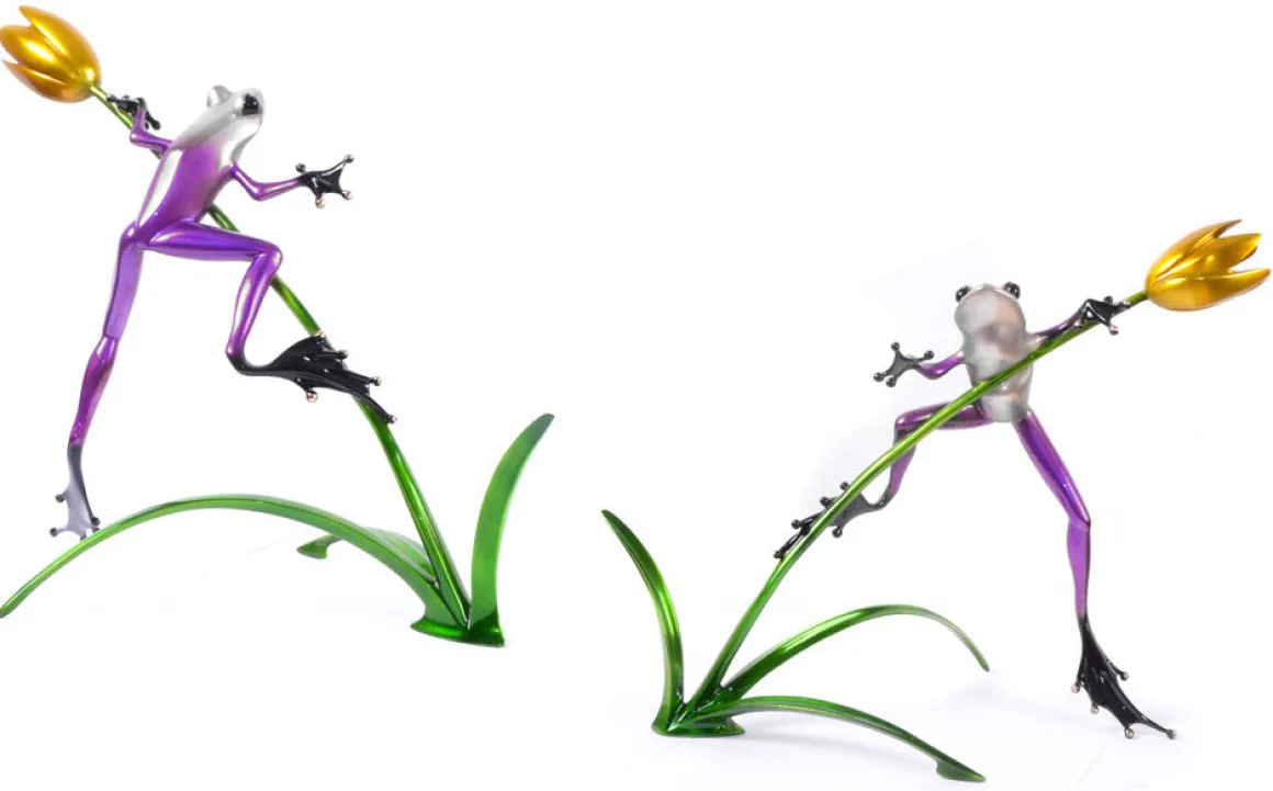 Now for sale online at Dolphin Galleries! The Belle Fleur.A lavender frog anxiously climbs the stem of a gold nitrate tulip.