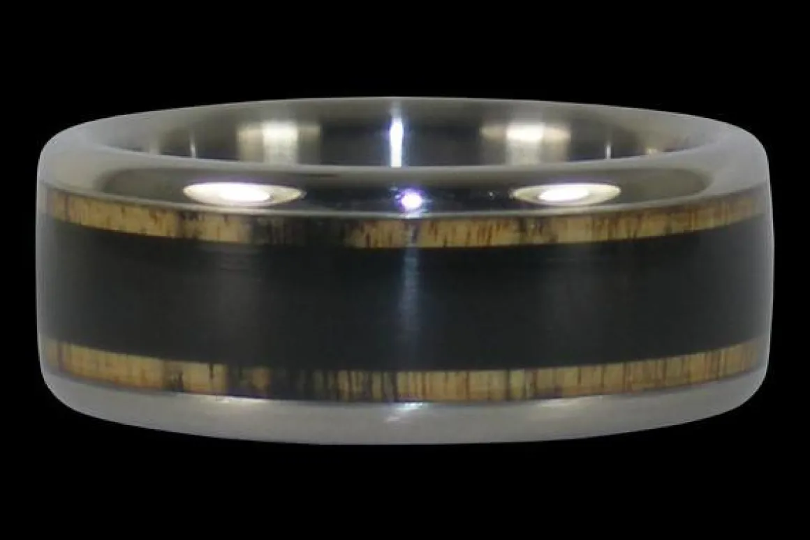Wide Titanium Ring for a bigger finger embedded with a wide Black and White Ebony center with Black Ebony wood outlining bands, beautiful gift for a man or woman. Beautiful as a matching ring set; available in a slender width for smaller fingers.