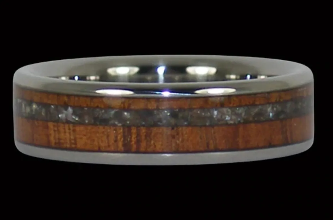 Men and women’s titanium ring bands for beach wedding, anniversary in the tropics, or birthday get-a-way. Matching sets for couples to share the same wood and stone. A thin inlay for subtle but stunning style.