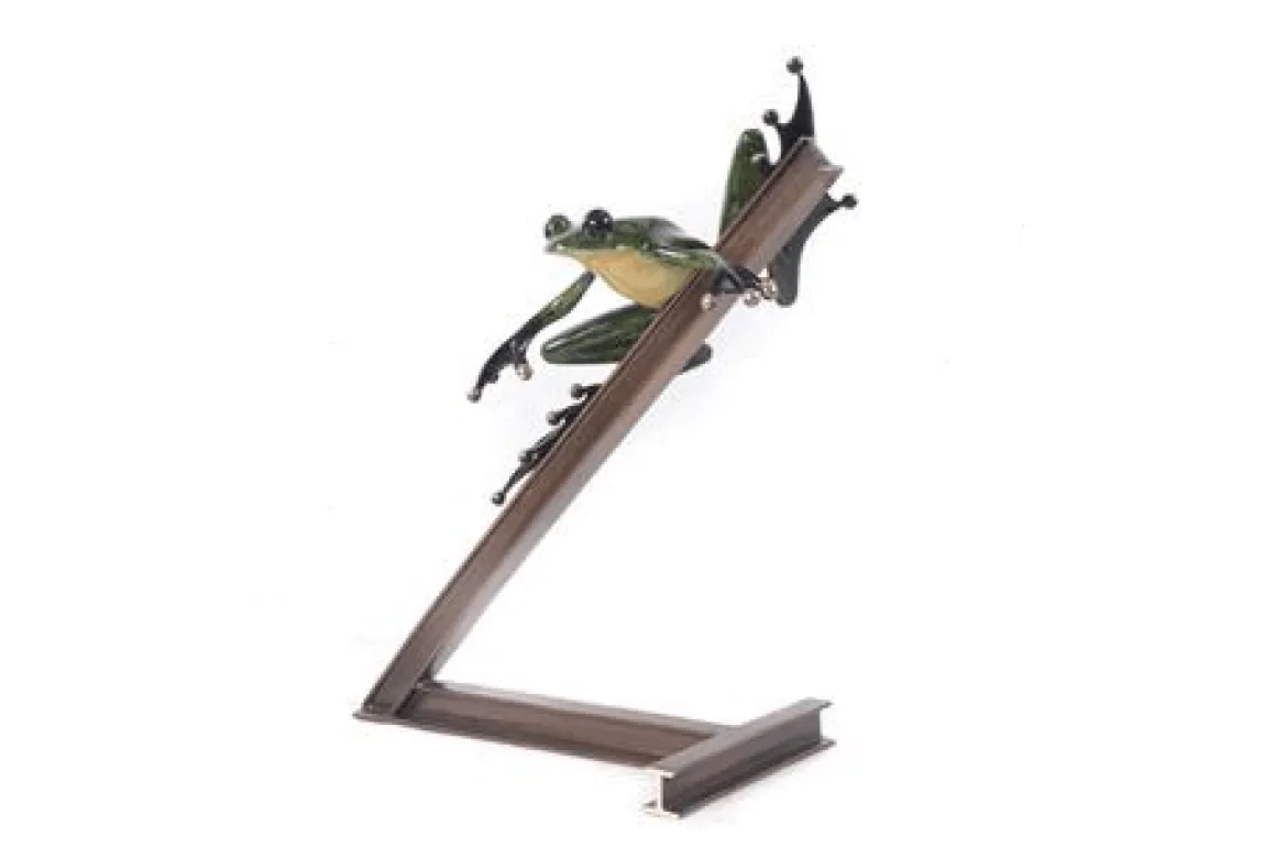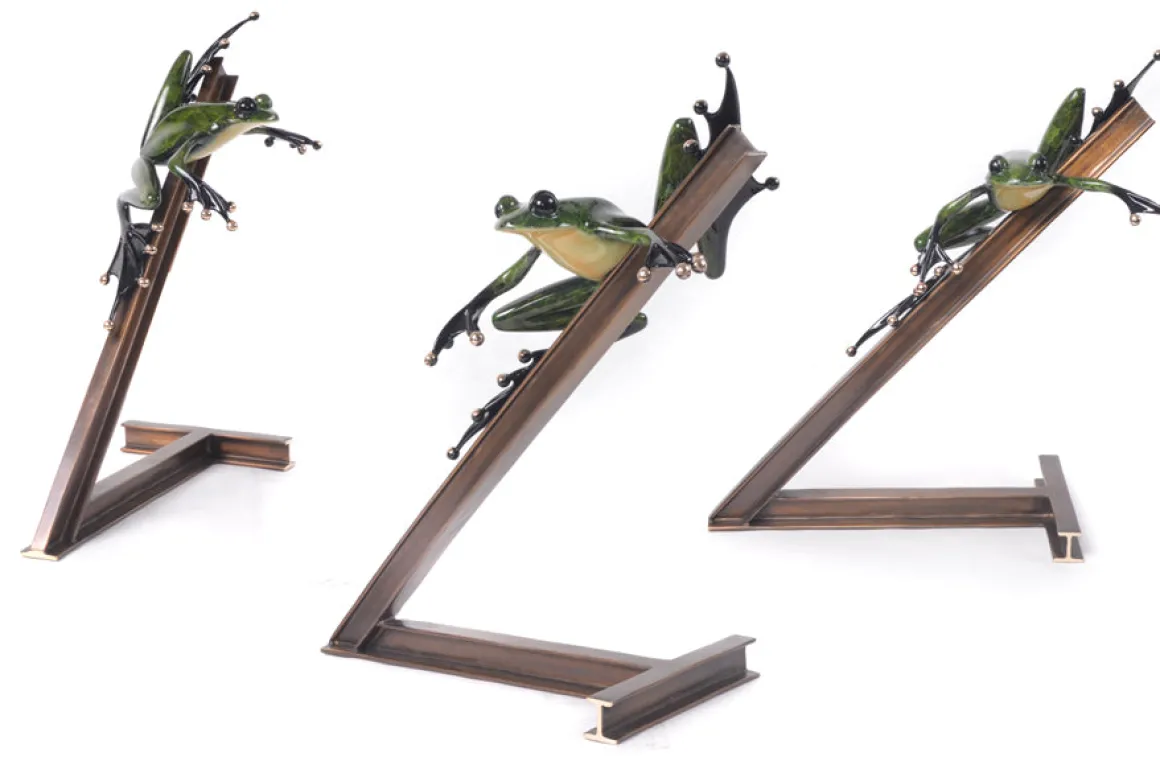 Now for sale online at Dolphin Galleries! The Breaks Over.A bold, signature green frog balances precariously on a steel girder as he ventures back to work.