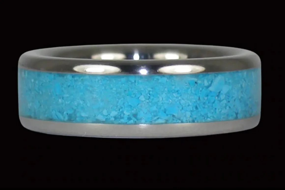 December Birthstone Titanium Ring embedded with sky blue Turquoise; bye bye blue sky hello beautiful blue stone; a beautiful addition to your turquoise collection.Turquoise is the national gemstone of Tibet and has been believed to ensure good fortune andhealth.
