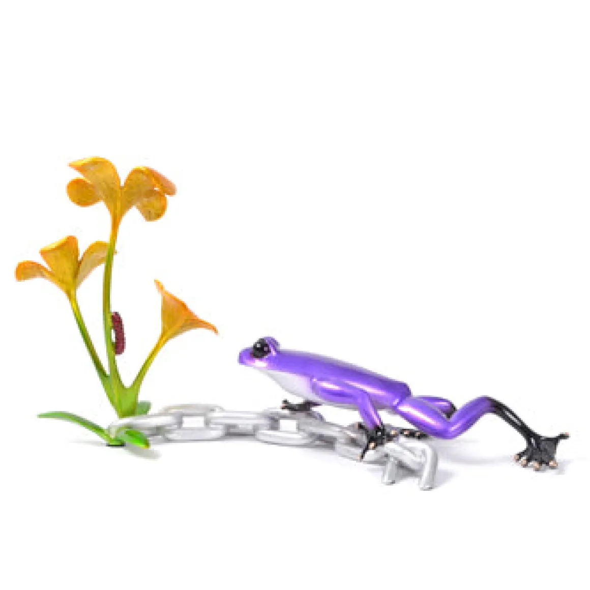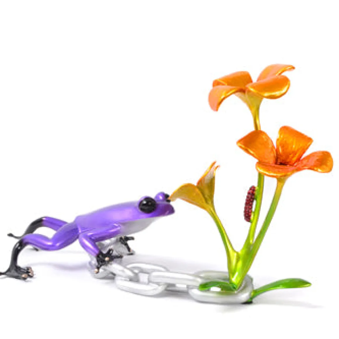 Now for sale online at Dolphin Galleries! The California Gold.According to Wikipedia, a wildflower is a flower that grows where it was not intentionally seeded or planted, even if it is growing where it would not naturally grow. Randomly linked by a silver chain, variegated gold petals contrast beautifully with a saturated purple frog. California Gold, Tim Cotterill’s 2021 Mother’s Day sculpture, clearly exemplifies this natural phenomenon.