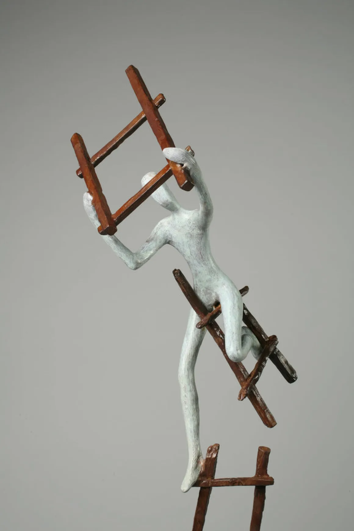 Challenge presents a powerful meditation on perseverance when the way forward is anything but clear. Two figures with soft verdigris patina scale a dark, broken ladder—rungs missing, structure twisted, gaps that would stop most climbers. Yet they climb anyway, reaching for the next handhold wherever it may be.