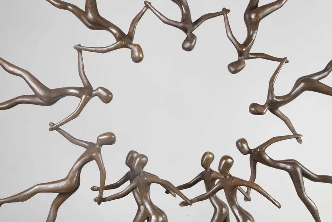 Circle of Life 11 presents a striking meditation on human interconnection. Dark bronze figures stand hand-in-hand at the base while above them, bodies form an eternal wheel—each figure reaching toward the next, creating a circle without beginning or end.