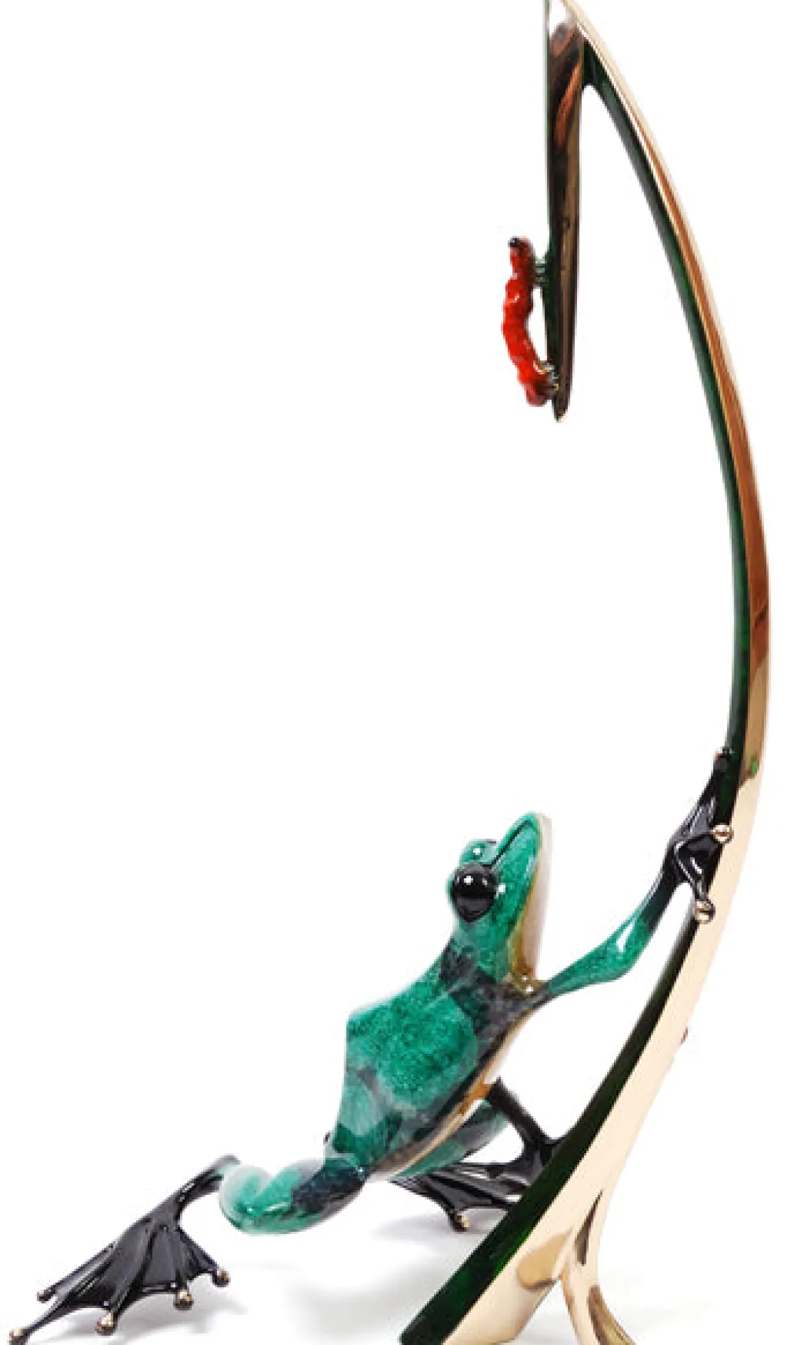 Now for sale online at Dolphin Galleries! The Dinner for Twosculptural piece byFrogman Tim Cotterill.Dangling by a thread, the red caterpillar is about to drop into the waiting mouth of a hungry green frog.