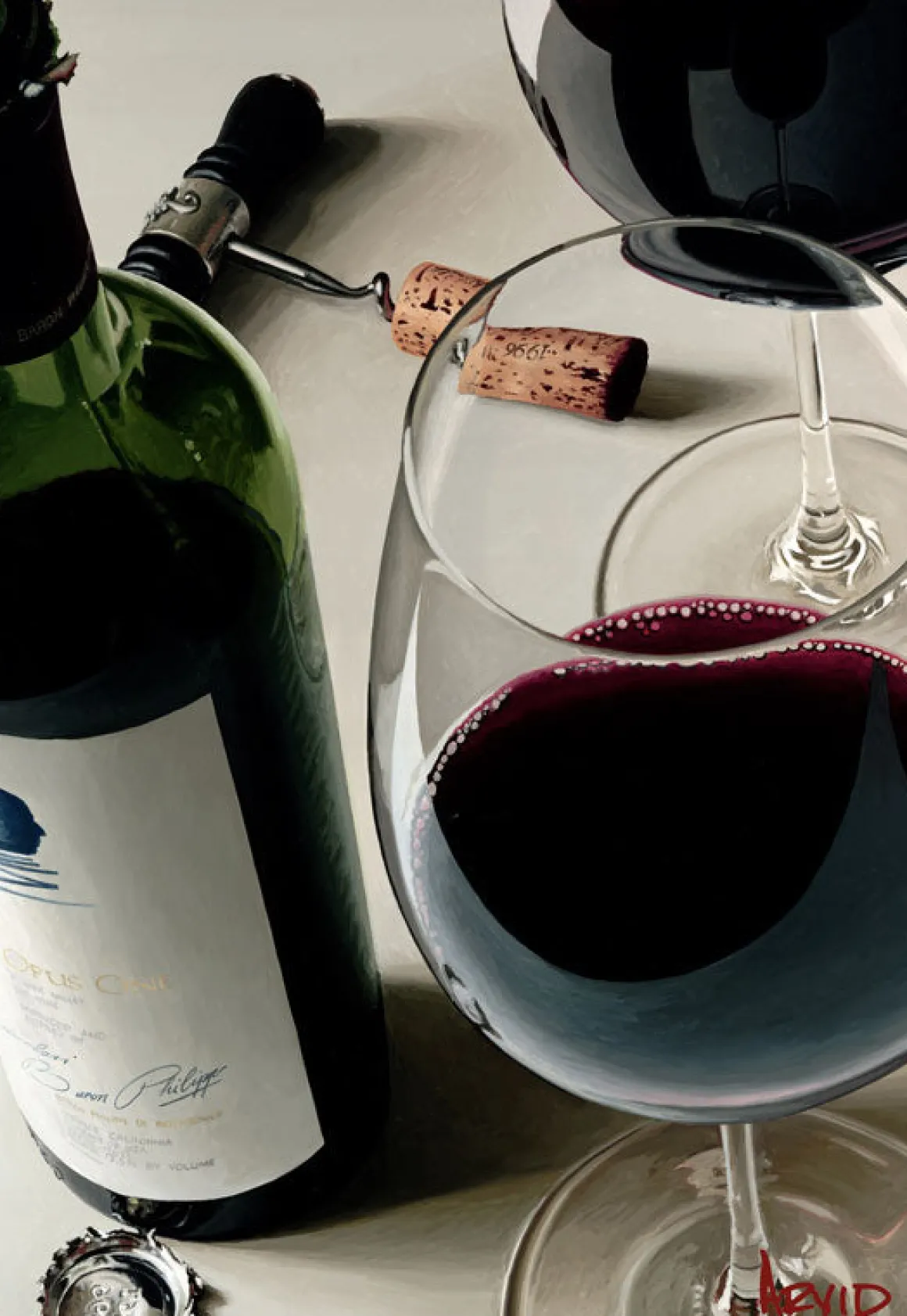 Arvid describes the depth that he finds in his work: “Wine is a great subject to paint because it has so many different elements: hot and cool surfaces, fluid, wood, glass, chrome, cloth. As a painter, it gives me so much to draw from. ‘Elements’ is a perfect example that combines all of the elements that I like to work with in a painting. It is a composition of textures and materials as well as color and space.”
