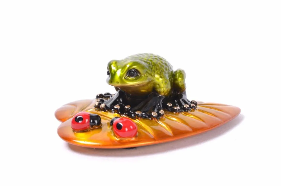 Now for sale online at Dolphin Galleries! The Elf. A textured green toad perches atop a copper-toned leaf, fixated by two brilliant red ladybugs. Elf, Tim Cotterill’s 2020 holiday release, is certain to bring yuletide cheer to the Frogman pond.