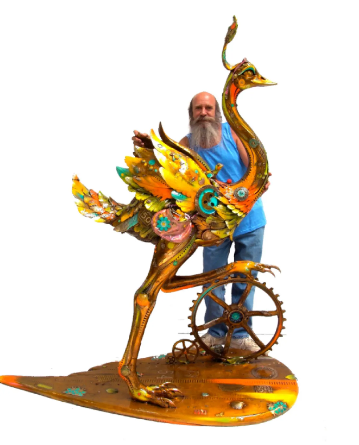 Elizabeth strides forward with fashionable determination, this magnificent life-size bird sculpture standing tall on one elegant leg while the other has been whimsically replaced by a steampunk gear wheel. Her resplendent plumage cascades in vibrant yellows, oranges, and greens, while a pink designer purse—her “life support system”—dangles from her wing. Her long, graceful neck curves upward to a feathered crest, conveying both elegance and excitement. Turquoise gears and colorful accents adorn her body as she poses atop a decorative surfboard-shaped bronze base.