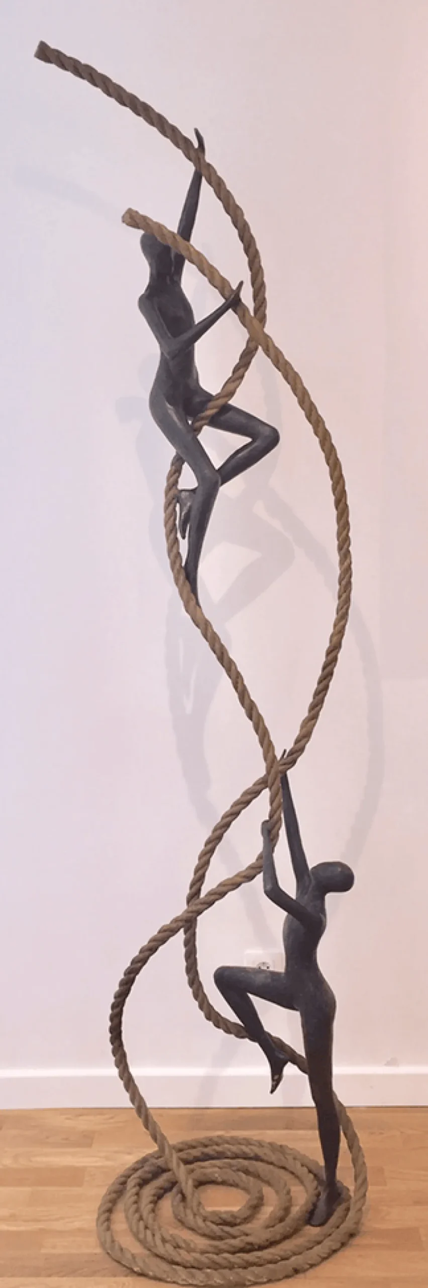 Encouragement 2 expands on the theme of mentorship with dramatic scale. Two dark bronze figures ascend a pair of intertwining golden ropes that rise in a helix from a coiled base. The upper figure leads the way, looking back to guide the one below, while the lower figure reaches upward, inspired by the path being forged ahead.