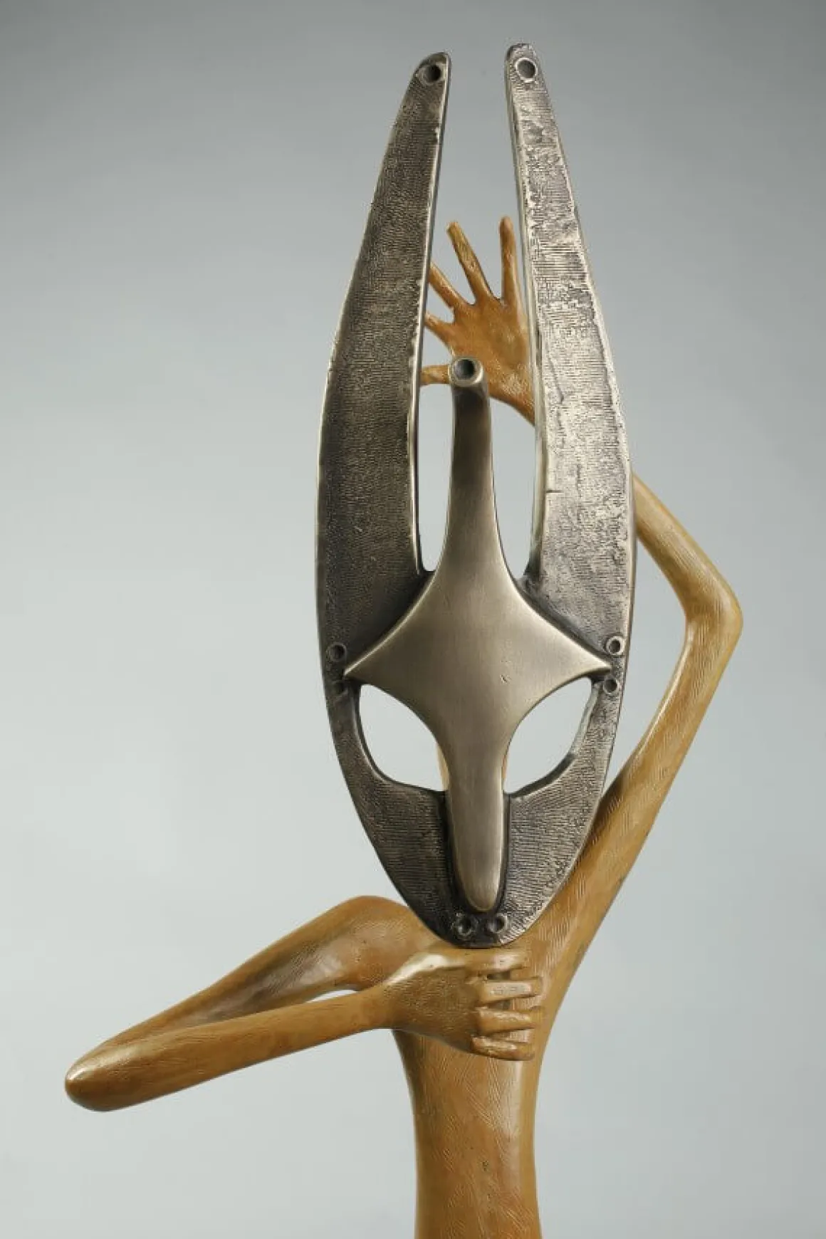 This sculpture celebrates the universality of the mask as a tool for transformation and connection to the divine. The contrast between the warm, organic human form and the cool, stylized metal mask creates a powerful dialogue between the personal and the archetypal.