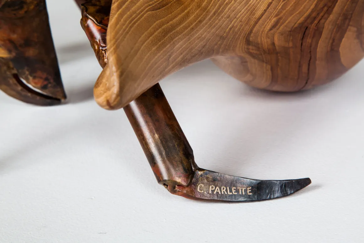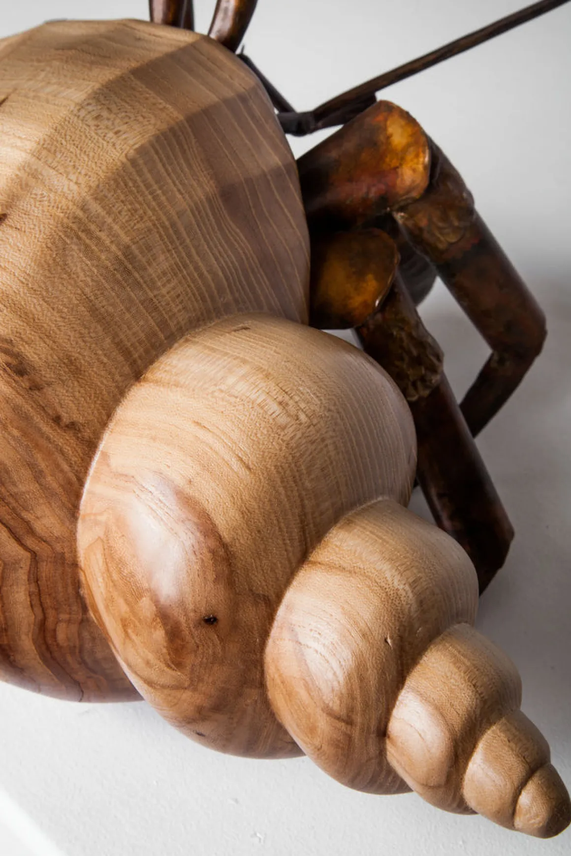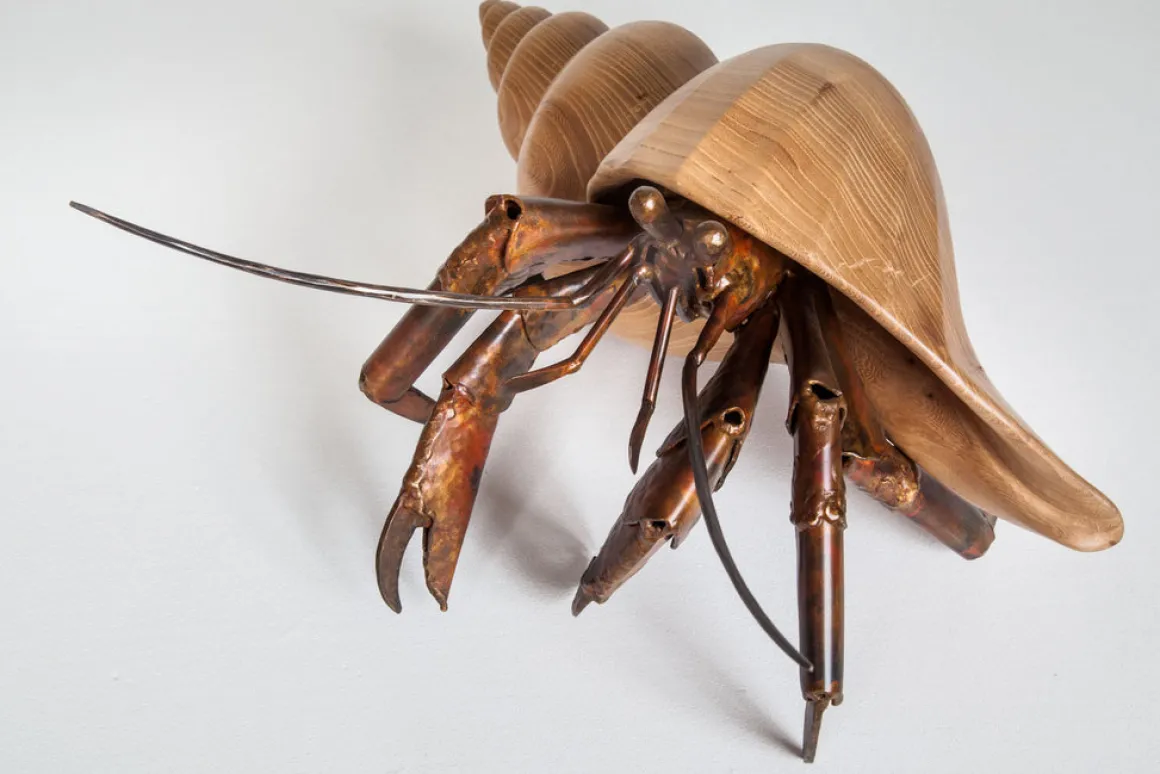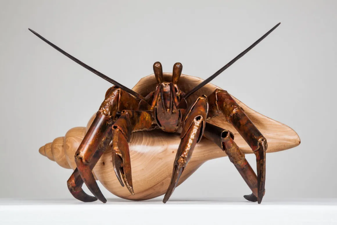 A hermit crab is always on the lookout for the next best shell. All renditions of Finders Keepers feature a welded bronze hermit crab in a dashing wood shell. Seen here: acacia and walnut.