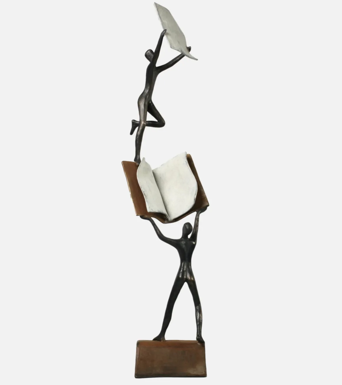 First Book celebrates the transformative power of reading. A dark bronze figure stands at the base, arms raised to hold an enormous open book—warm brown cover, white pages spread wide like wings. Above, another figure perches on those open pages, holding a single page aloft in triumph, as if they’ve just discovered the secret to flight.