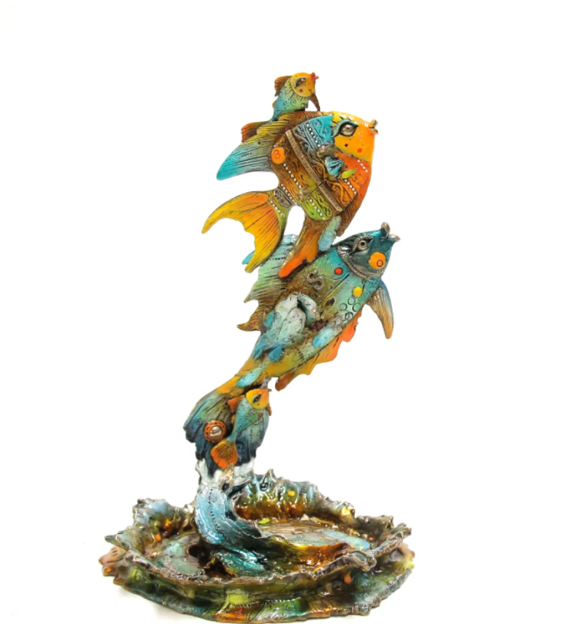 This exuberant family of four fish captures the pure joy of leaping through warm tropical waters. Stacked vertically in a dynamic upward spiral, Henry, Stella, and their twins burst from an intricately sculpted water splash base in brilliant hues of turquoise, orange, yellow, and sea green. Each fish is adorned with Nano Lopez’s signature decorative elements—dots, patterns, and whimsical details—creating a sense of playful movement and familial connection. The piece radiates energy and the simple pleasures of catching air on a sunny day.