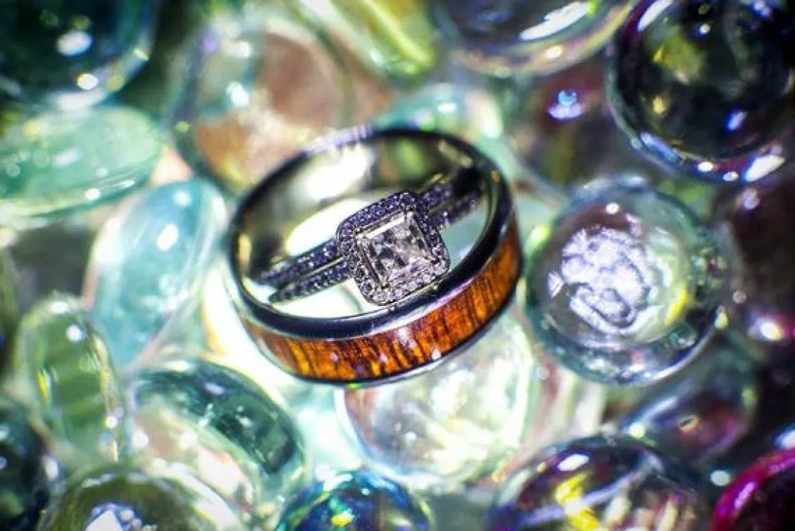 Titanium Rings embedded with Kiawe which is Mesquite wood; perfect for your meat smoking man or woman. Over 150,000 acres of Kiawe forest in Hawaii were started from one tree planted at the corner of a Honolulu church in 1828. Kiawe trees grow all along the Kona coast and locals will warn you to wear thick bottomed shoes because of the enormous sharp thorns that grow on the branches and fall on the ground below.