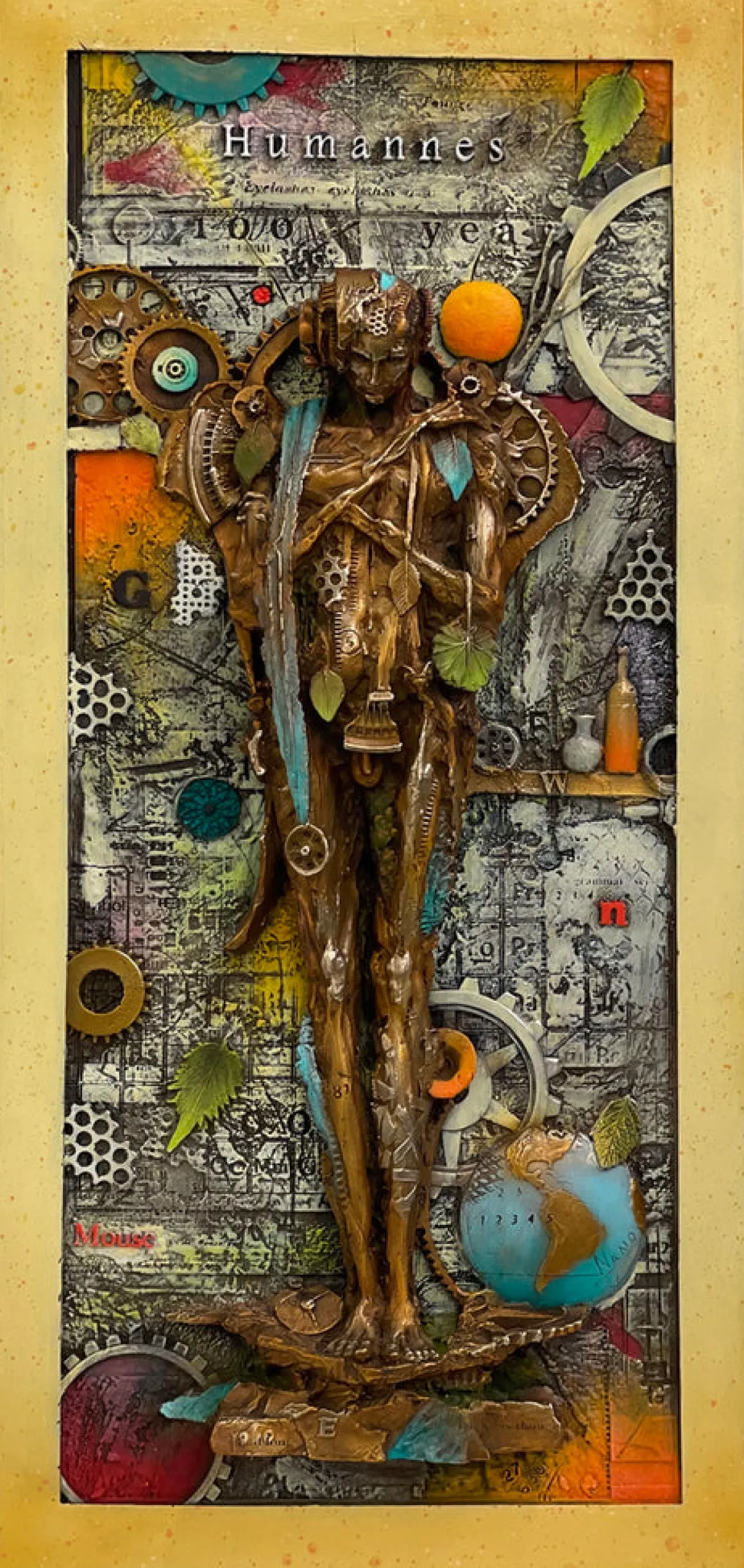 Man dot Earth Relief Large presents the powerful Man dot Earth figure as a dimensional bronze relief sculpture. The steampunk-inspired human form—with its interwoven gears, mechanical elements, and turquoise globe—emerges from a richly layered mixed-media background. Warm earth tones and textured paint create depth behind the gleaming bronze figure, whose outstretched arms form a living scale balancing industry and nature. At 21″ x 10″ with 3″ of depth, this wall-mounted piece brings Nano Lopez’s contemplation on humanity’s relationship with our planet into a unique sculptural-meets-painting format. The elegant framing contains the artistic background while highlighting the dimensional bronze centerpiece.
