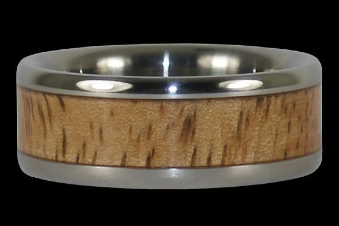 Titanium Ring band with Hawaiian grown mango wood; beautiful for men and women to share a piece of nature. The mango tree is the sacred symbol of love in India; perfect romantic anniversary gift.