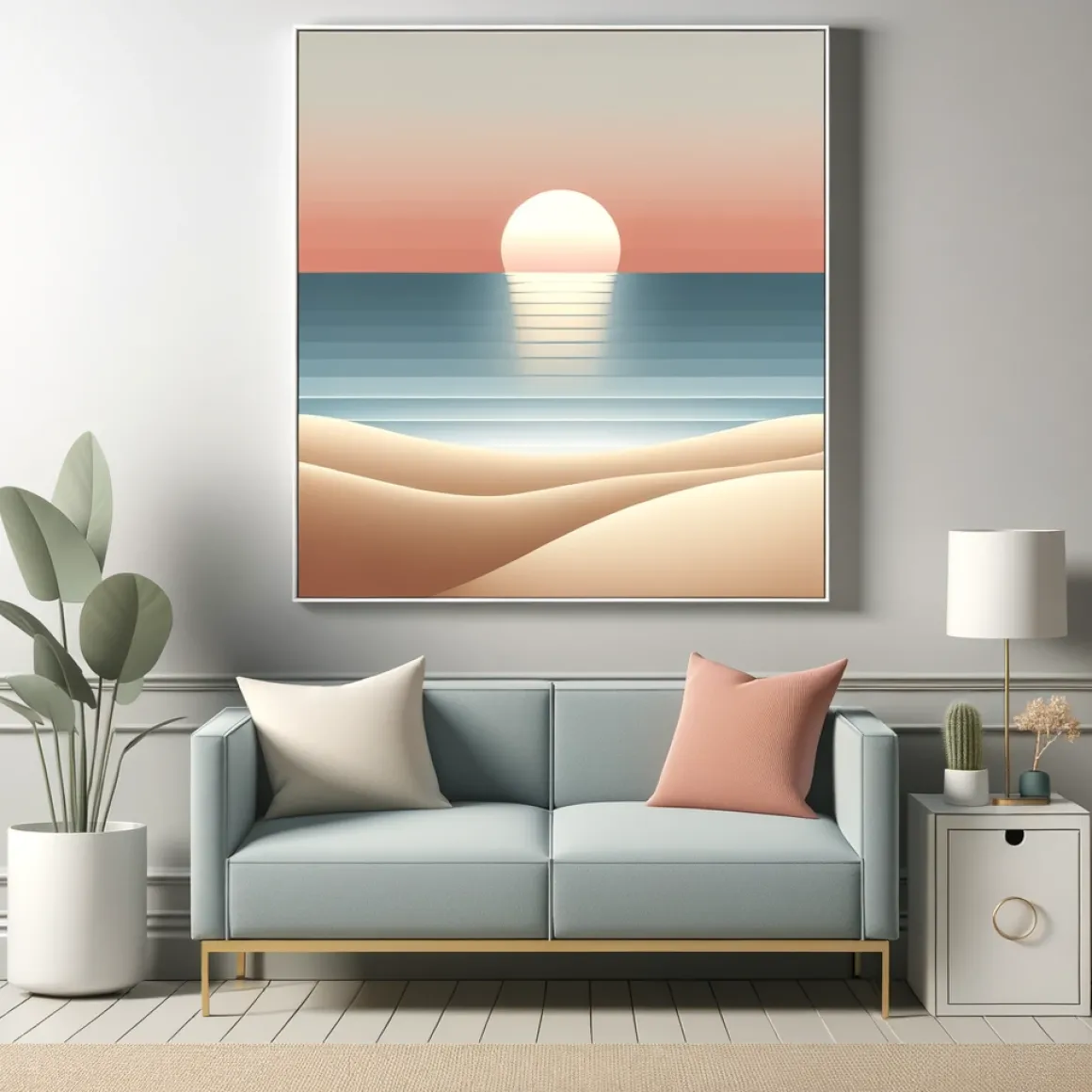 Modern Sunset Coast is perfect for modern decor. Featuring a serene beach scene with soft pastels and minimalist geometric shapes capturing the sun setting over the horizon, this stylish and modern wall art piece will bring a tranquil feel to any space.