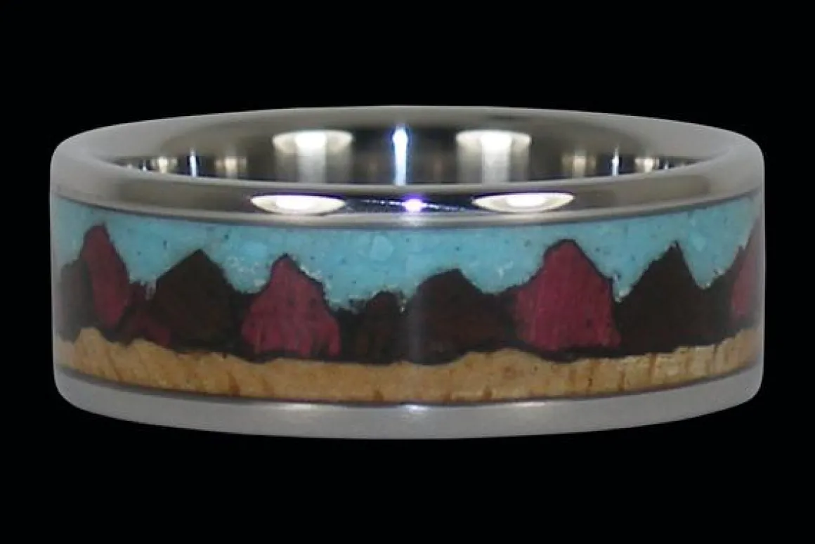 Titanium ring set with wood and stone mountain range. Choose your wood and stone for this design. Night and day scenes available. Intricate design for hikers and outdoorsy couples. Men and women’s unisex wedding bands or anniversary rings. We are here to help you customize.