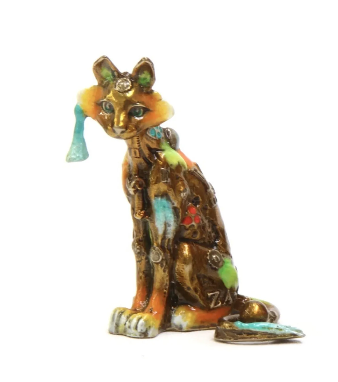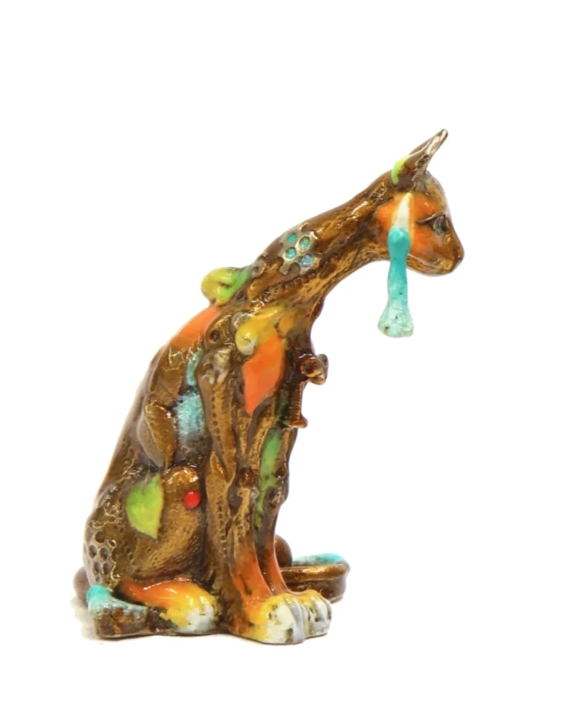 Nano Edison sits with elegant poise in miniature form, this tiny alley cat capturing all the charm of his larger siblings in a collectible size. Rendered in warm golden bronze with orange and turquoise accents, he features a playful tassel dangling from his ear and his signature knowing expression. Even at this diminutive scale, every surface tells a story through embedded flowers, letters, and patterns—a pocket-sized masterpiece that brings Nano Lopez’s artistry into the smallest spaces.