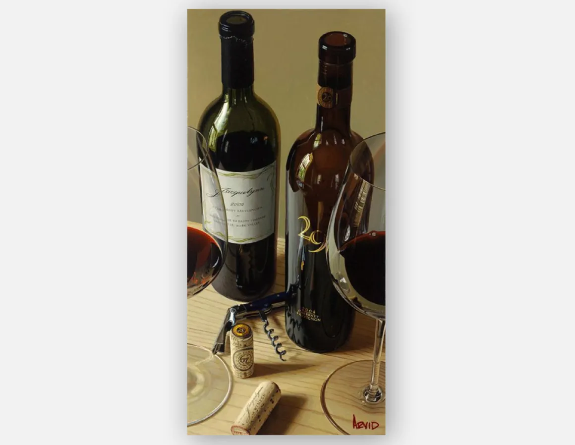 With unparalleled expertise, Arvid invites us to witness the beauty of a harmonious meeting between art and wine. Two exquisite bottles provide a duality of elegance and power that marries perfectly with the balanced interplay between positive and negative space. When paired with the complimentary array of colors, the composition tips the scale to satisfy our desire for the “Perfect Balance.”