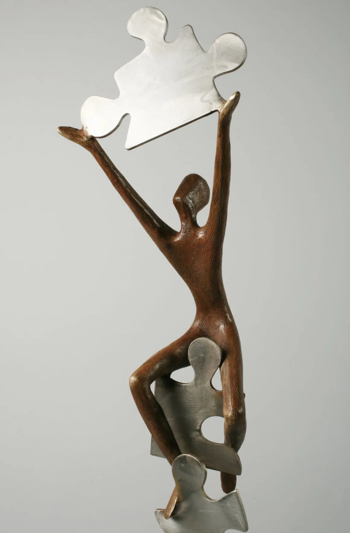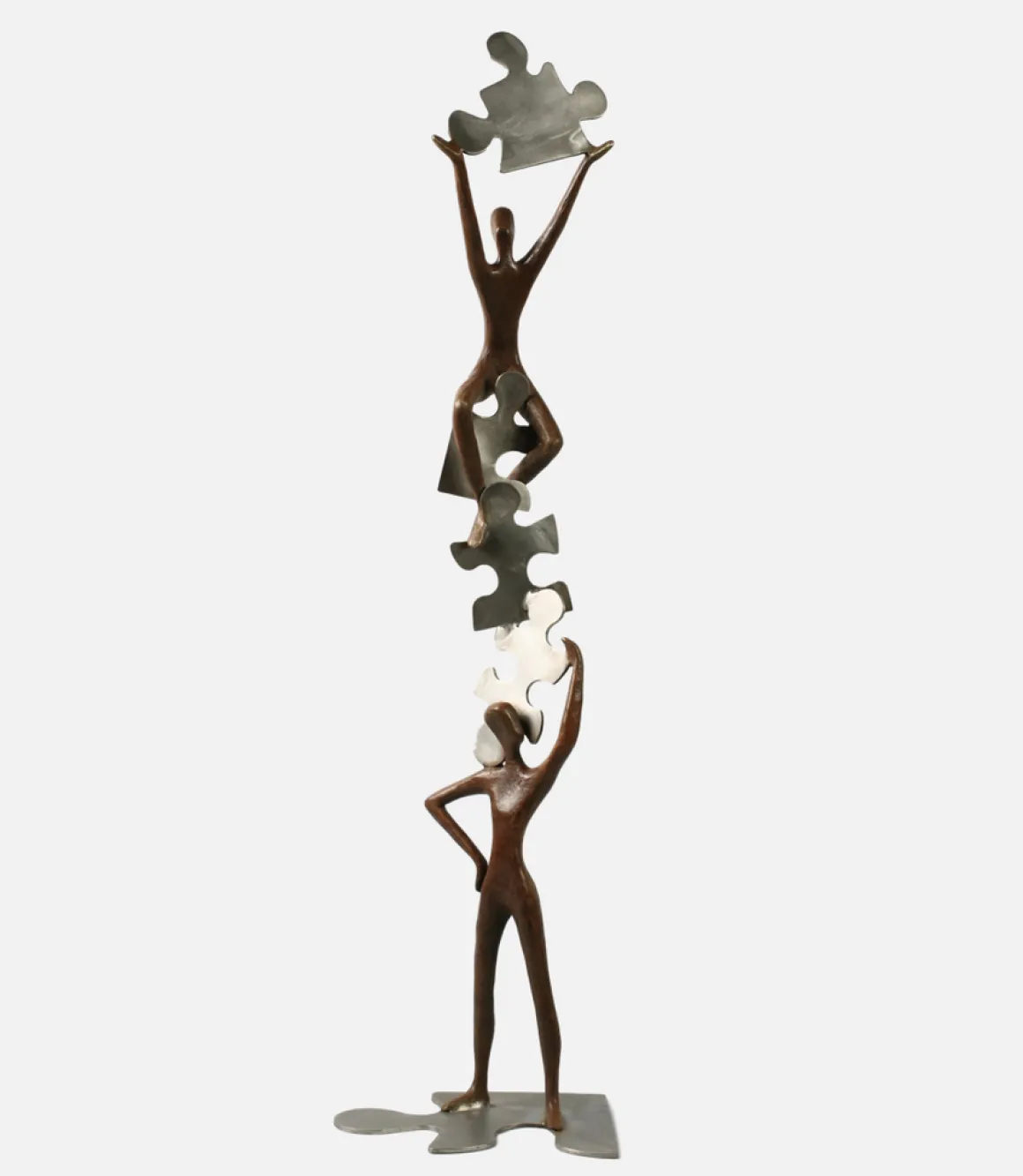 Puzzled transforms the human journey into a vertical tower of interlocking challenges and collaborative solutions. Bronze figures climb through and around massive puzzle pieces—supporting each other, passing pieces upward, until at the summit, a figure triumphantly raises the final piece toward the sky.