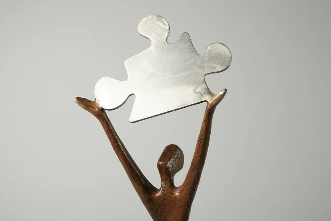 Tolla Inbar’s design plays with scale and metaphor—the oversized puzzle pieces dwarf the human figures, yet they navigate them with grace and mutual support. The base itself is puzzle-shaped, grounding the entire composition in its central theme. It’s whimsical yet profound, playful yet deeply meaningful.