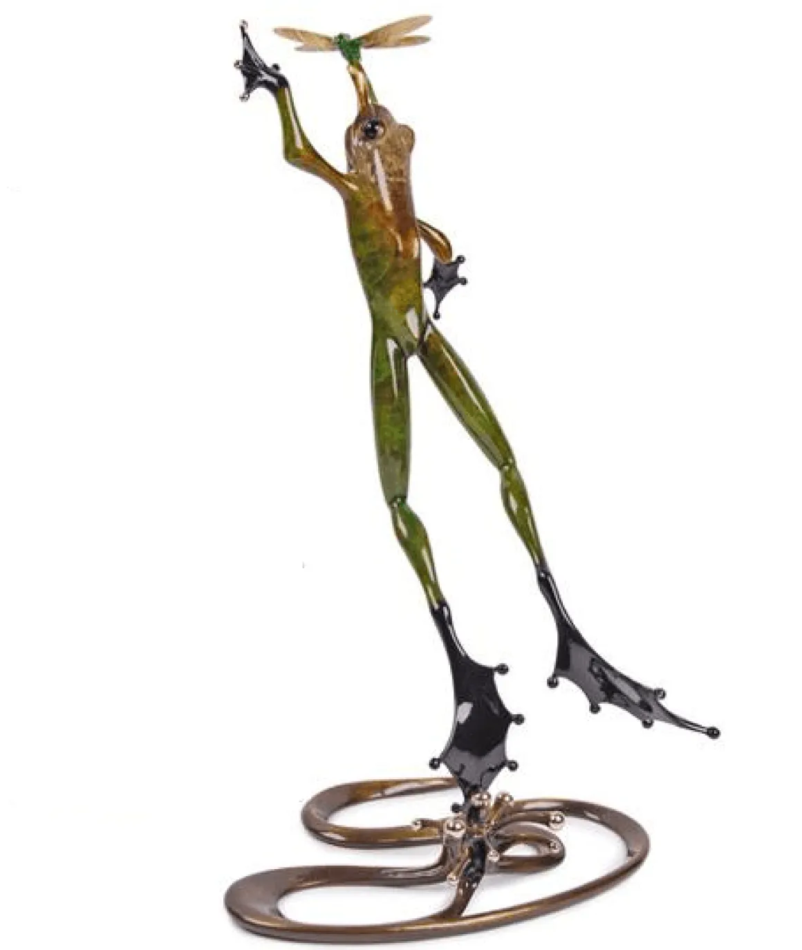 Now for sale online at Dolphin Galleries! The Quantum Leap.Bold, dynamic sculpture captures a frog in the act of jumping out of the water with a splash to nab a tasty dragonfly.