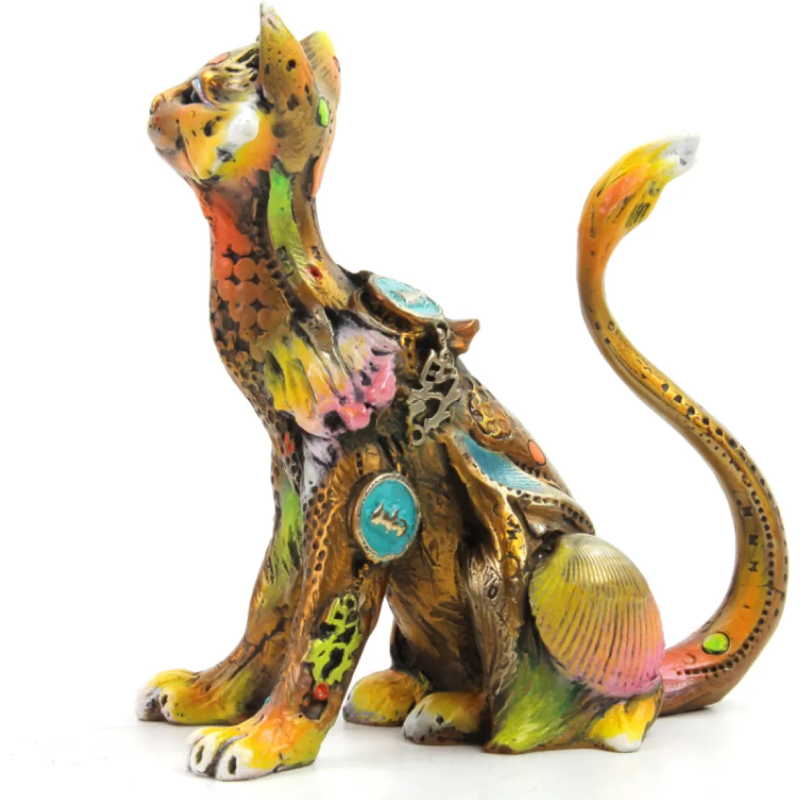Sally is an irresistible bronze cat who captures the essence of feline curiosity and contentment. Seated in a relaxed pose with her long, elegant tail curving gracefully behind her, she gazes upward with alert ears and an expression of quiet wonder. Her sleek body is alive with Nano Lopez’s signature riot of color—warm oranges and amber tones blend with splashes of pink, turquoise, and green across her coat. An ornate collar drapes around her neck bearing silver charms and medallions, while a striking turquoise disc adorns her hip. Sunflower-like patterns, scales, and intricate textures create visual interest at every angle. Sally’s compact size makes her perfect for tabletop display, bringing whimsical feline charm to any space.