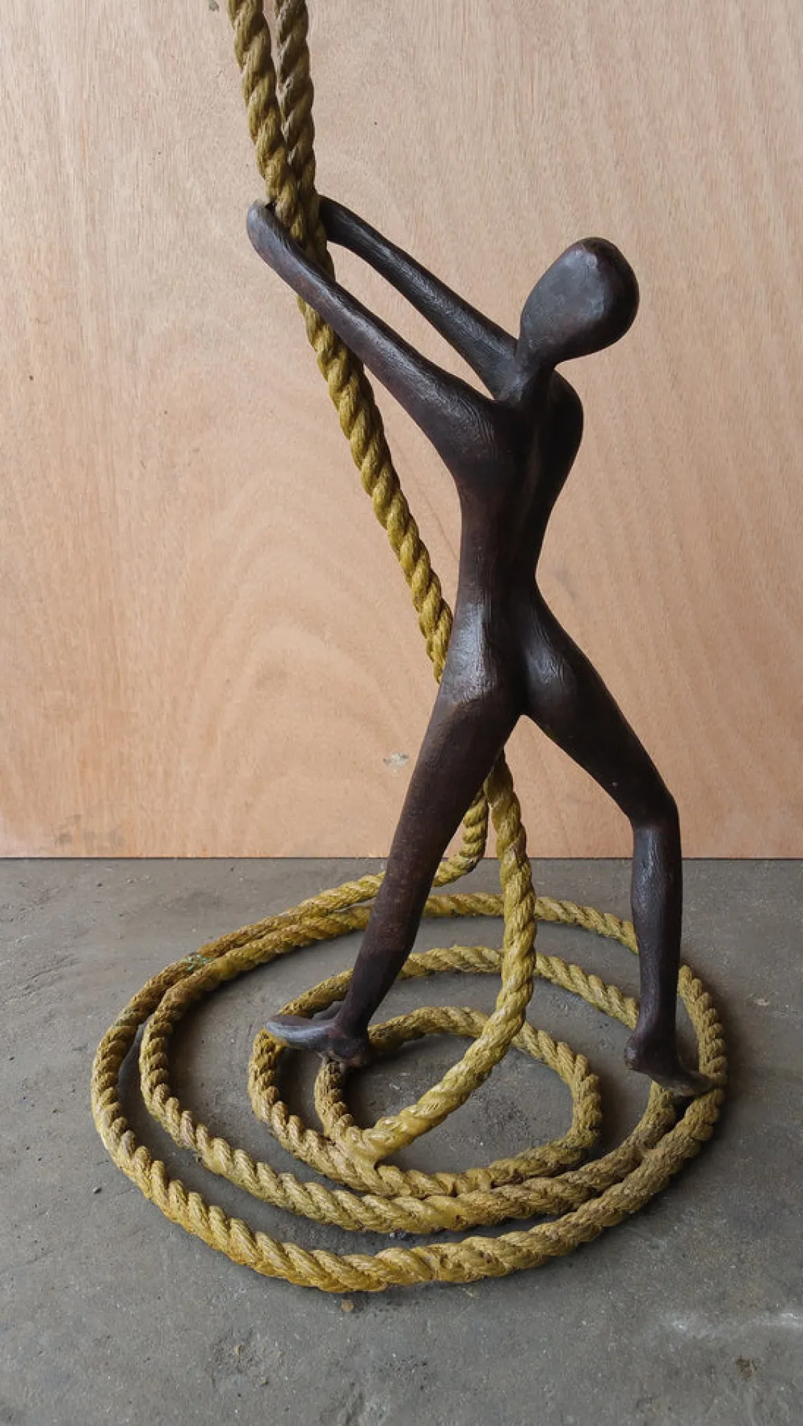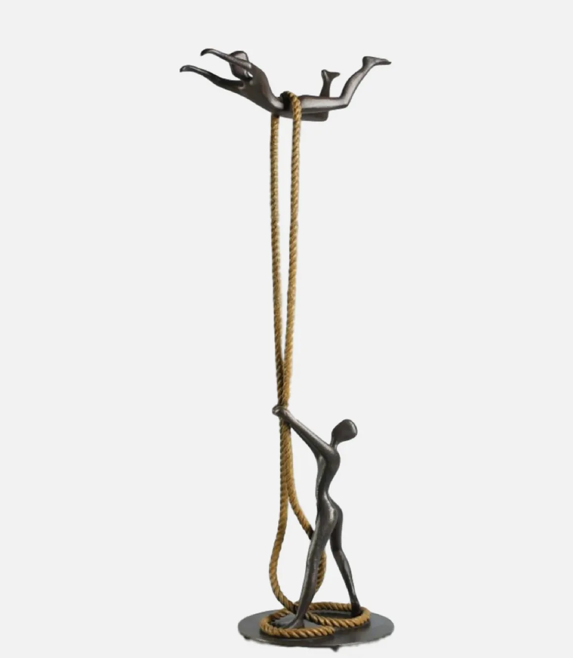The sculpture creates a stunning vertical composition, with the dark bronze figures contrasting beautifully against the warm golden rope that coils elegantly at the base. It speaks to dreamers, risk-takers, and anyone who has ever been supported by someone who believed in them enough to let them fly.
