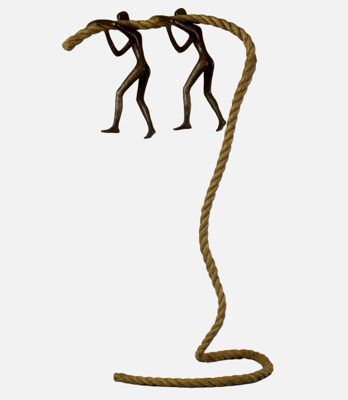 Spiritual Load depicts two dark bronze figures walking together, a massive golden rope draped across their shoulders as they lean forward into their journey. The rope swoops dramatically between them before cascading in elegant coils at their feet—a visual representation of the weight we carry through life.