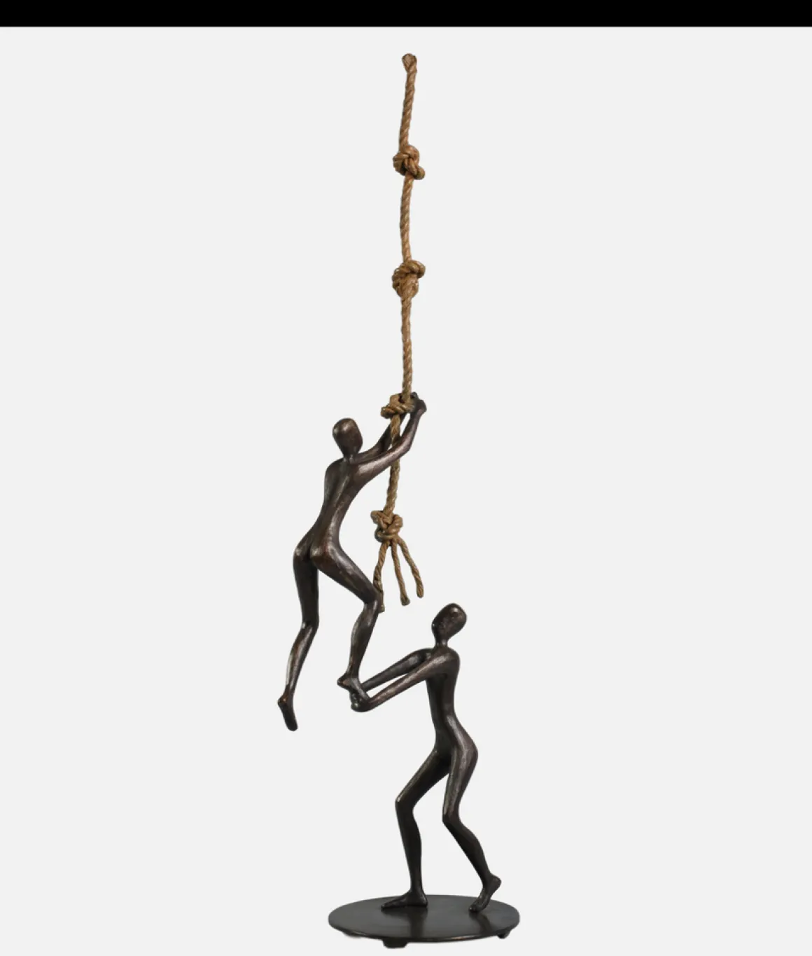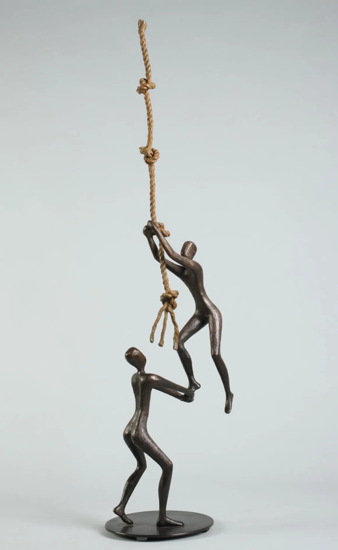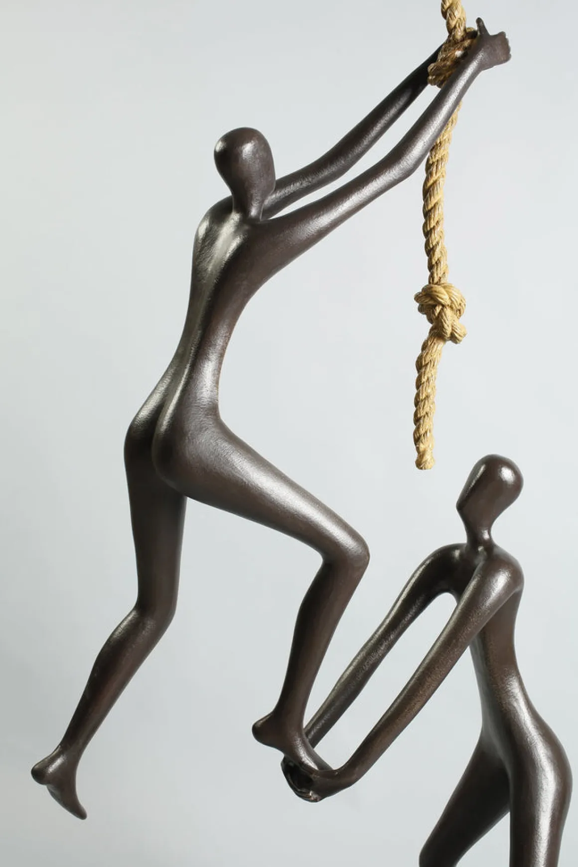 This sculpture captures a moment of pure, selfless assistance. The supporter doesn’t climb themselves; they have chosen to be the foundation upon which another’s dreams can stand. The knots in the rope represent the challenges and handholds on any difficult journey—but it’s the human support below that provides the crucial difference between falling and flying.