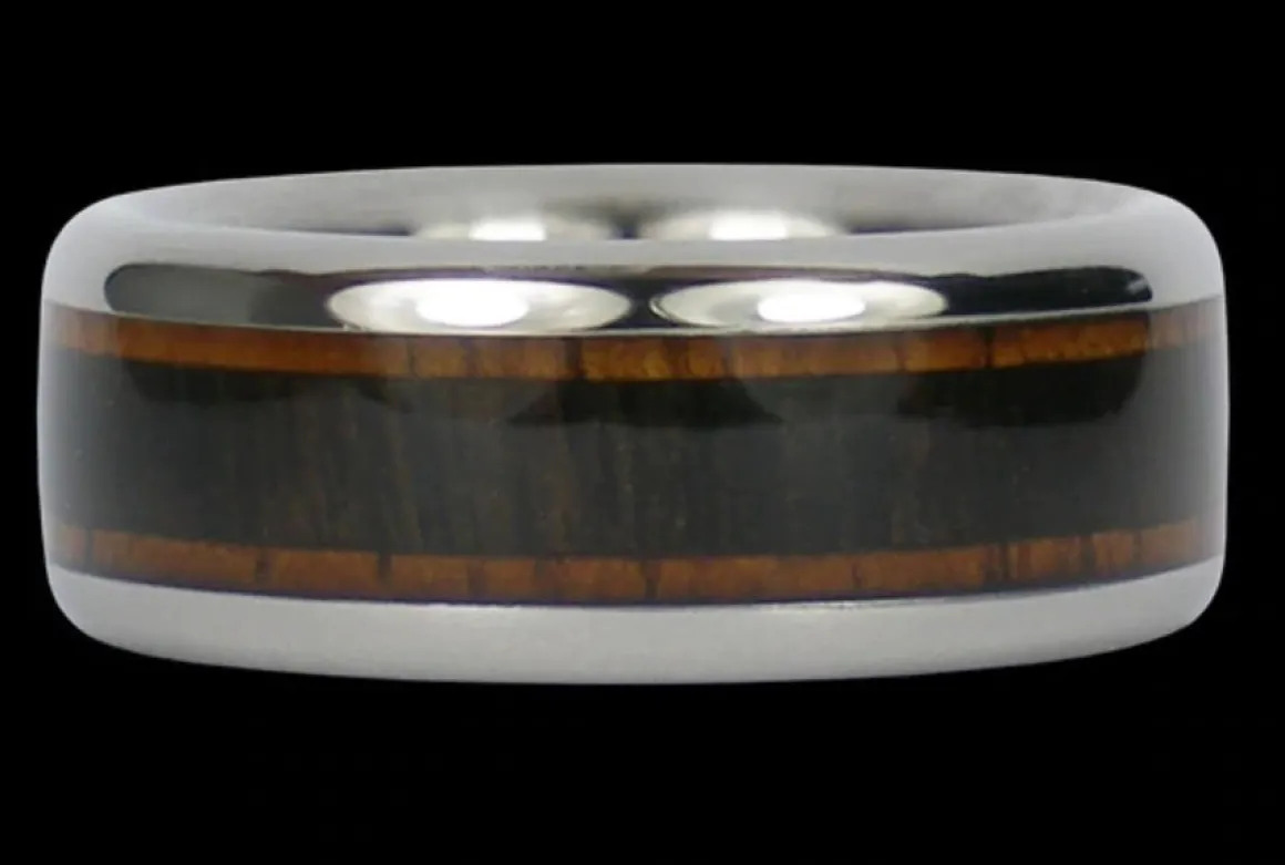Koa Wood and Black Wood Titanium Ring; gorgeous on a man or woman, perfect to celebrate a birthday or anniversary. Customize with an embedded diamond for your engagement ring or wedding band.