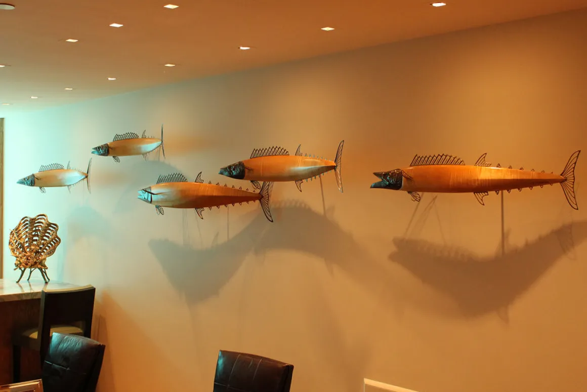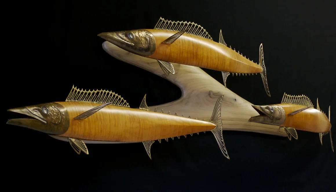 This piece captures the streamlined power and elegance of wahoo, which are among the fastest fish in the ocean. The bodies are carved of curly maple, which naturally has a tiger-striped patterning similar to that of a wahoo. The maple was bent to create the flowing curves that these fish demonstrate when swimming. The head is hammered and welded out of bronze with saw blades for teeth and polished stainless steel eyes. The fins are welded out of bronze rod.
