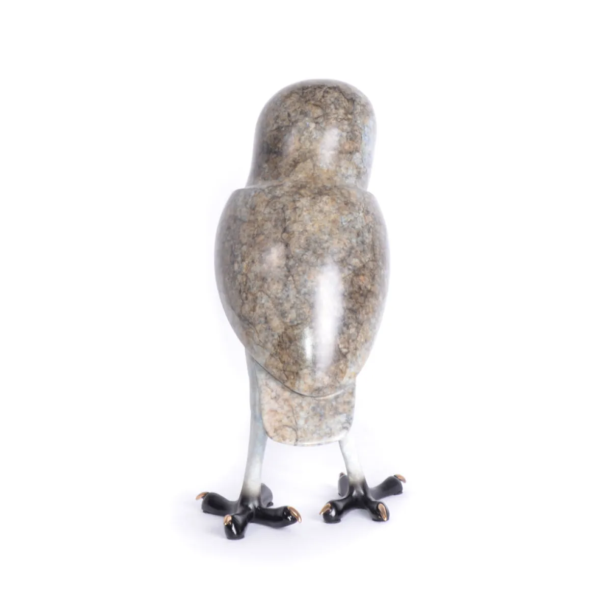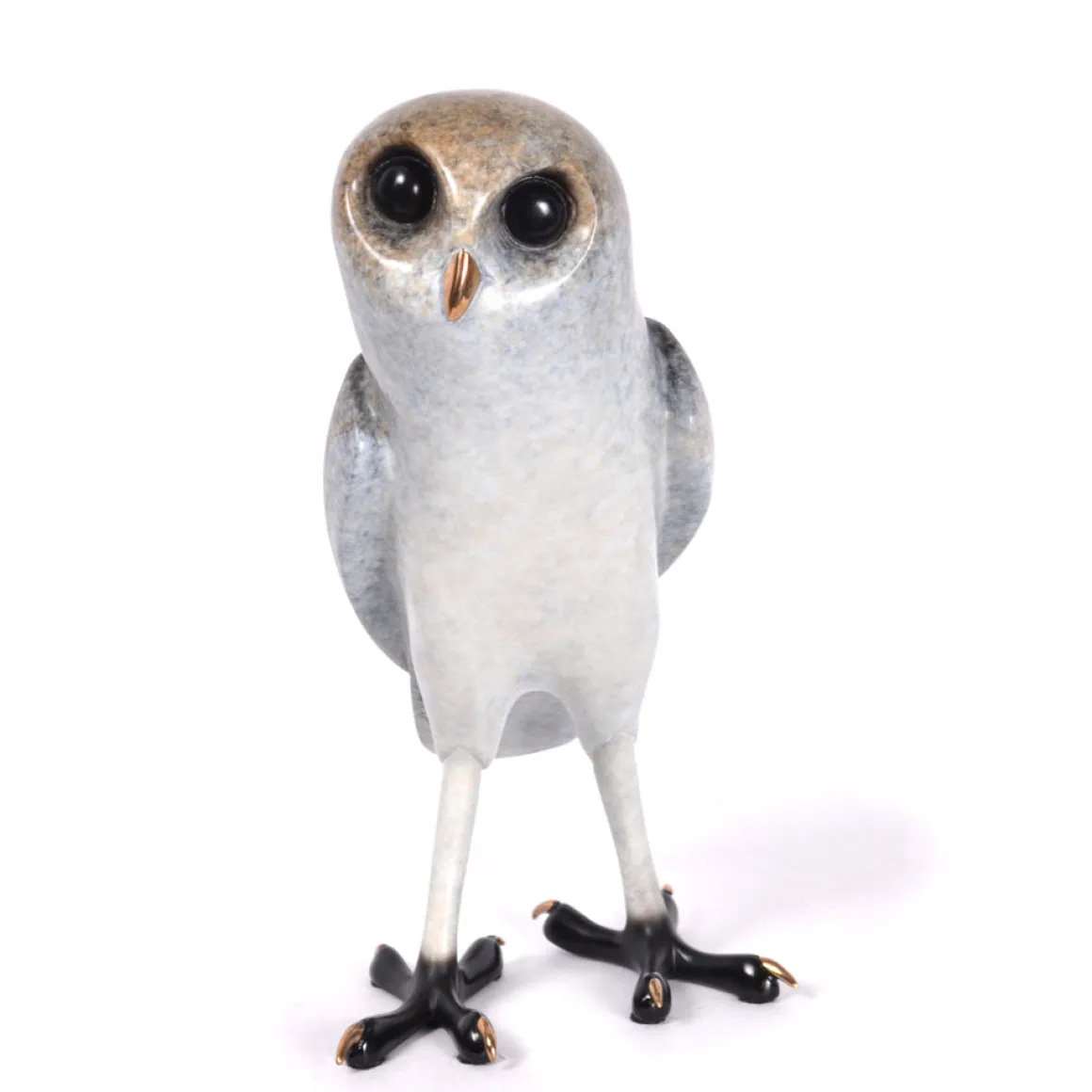 Now for sale online at Dolphin Galleries! The Wallis.Tim Cotterill’s iconic parliament is delighted to induct its 11th member, Wallis. Heavily patterned earth tones transition from the back of its slender form to a marbled, milky patina. Searching for a target, Wallis gazes keenly at its surroundings,clearly embodying characteristics of the typical, young barn owl.