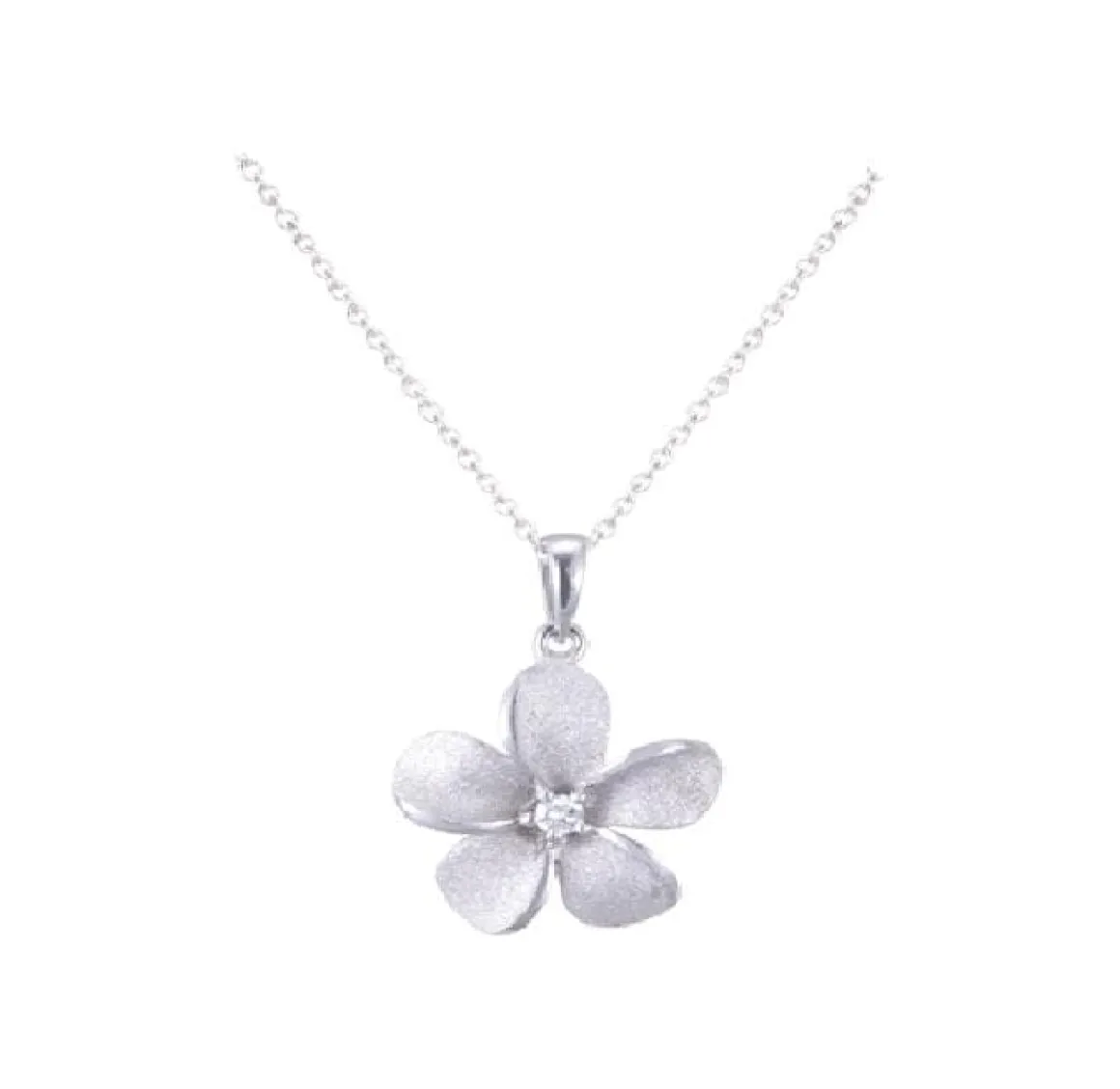This is a 14k11mm sandblasted gold plumeria pendant by Denny Wong. It features one 0.02 carats diamond.