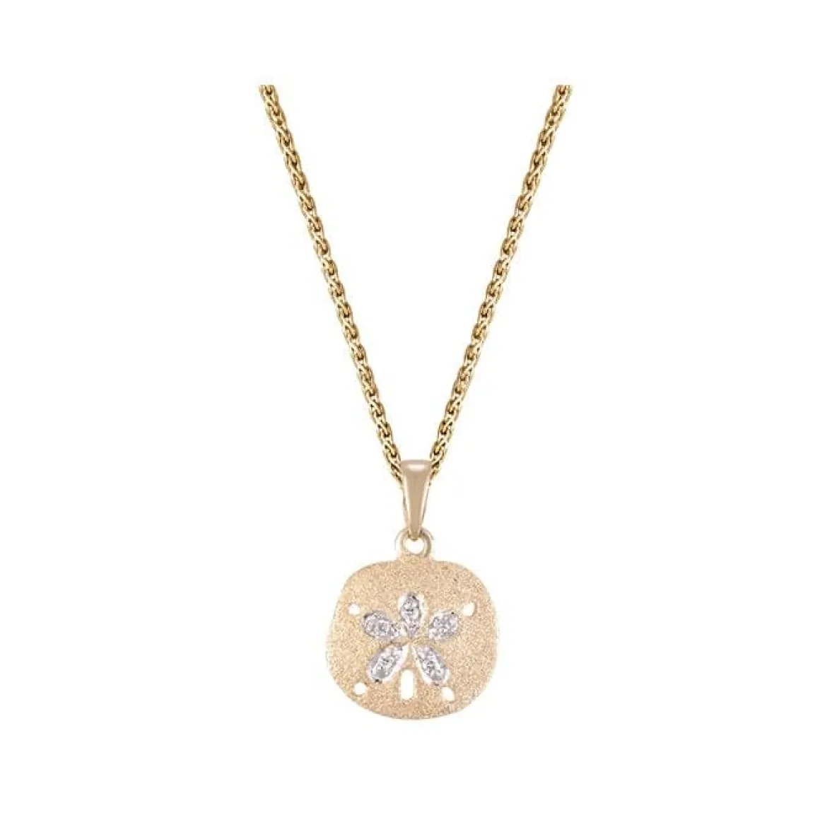 This is a 14k gold sand dollar pendant by Denny Wong. It features 5 diamonds totalingin 0.025 carats.