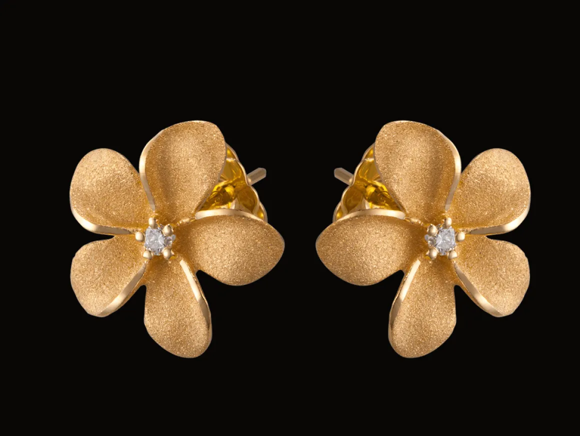 The plumeria collection by Denny Wong was created with the goal to capture the beautiful memory of Hawaii’s beautiful flowers. This earring features a 13mm sandblasted 14K gold and two .06 carat diamond.